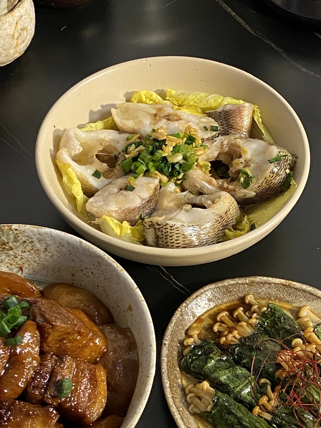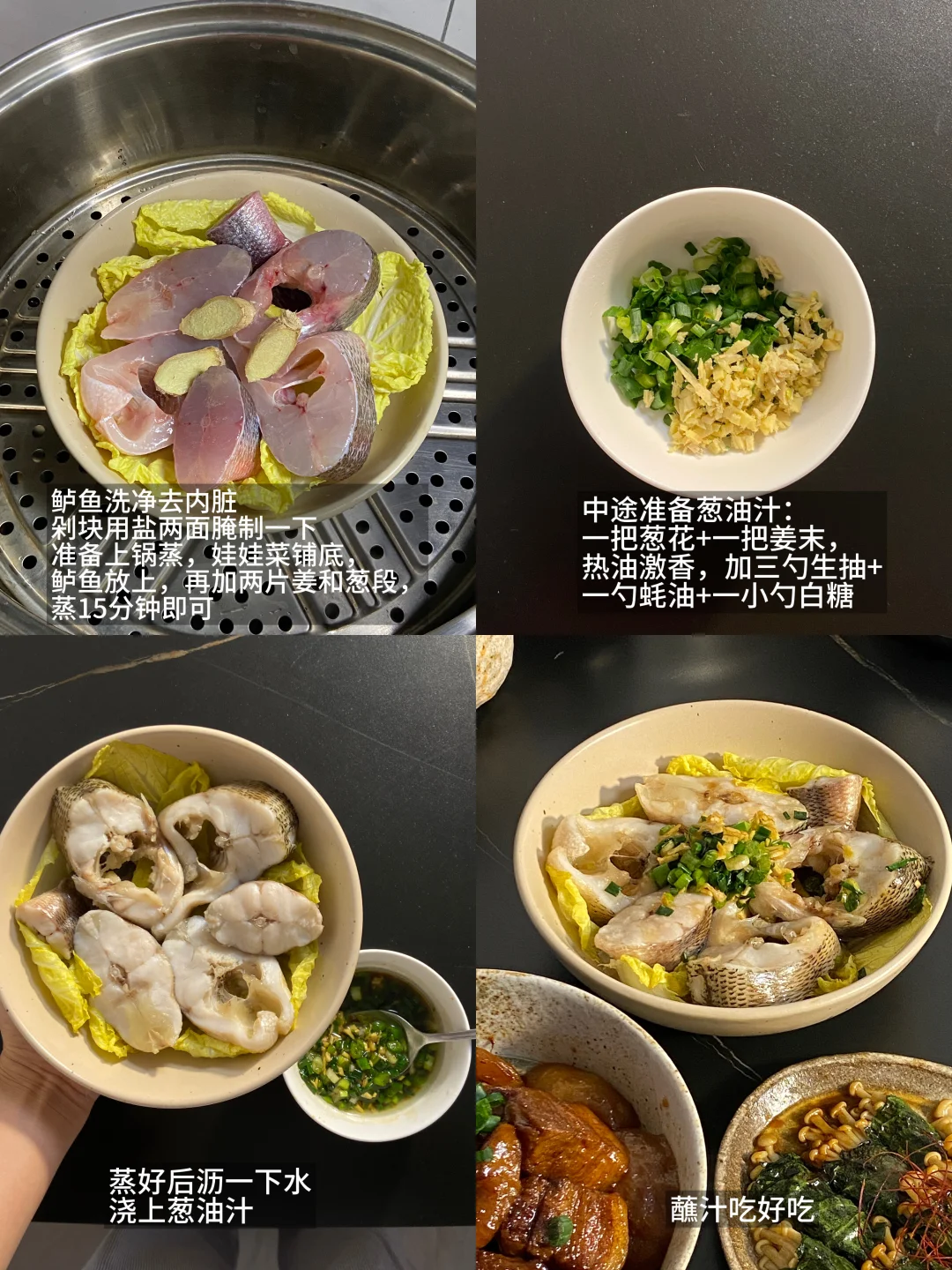 1)鲈鱼洗净去内脏,剁块用盐两面腌制一下,中途准备葱油汁