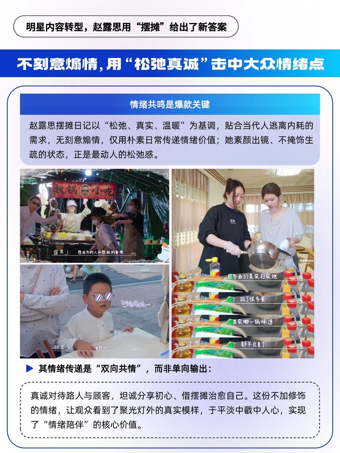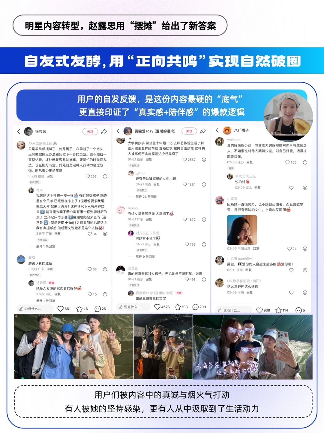 ✅情绪上贴合大众需求:当代人普遍追求松弛感、渴望摆脱内耗,赵露思放下明星光环,素颜出镜、衣着朴素,不掩饰自身的生疏,真诚对待路人与顾客,还坦诚分享摆摊是自己的初心,这份松弛与真诚,精准击中了大众的情绪共鸣点[赞R]