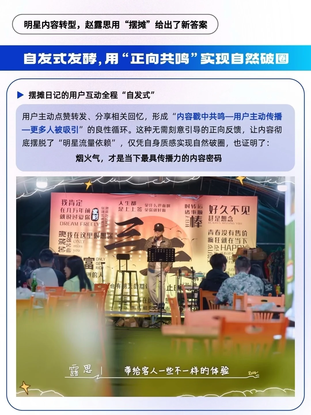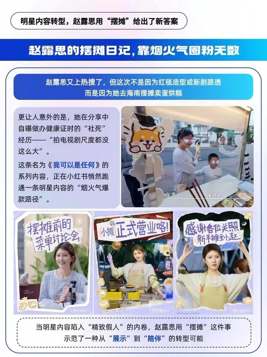 ✅结构上拒绝“滤镜化”:区别于多数明星内容只呈现高光片段,赵露思的摆摊日记完整记录了“筹备—摆摊—复盘”全流程,揉面失误、调试配方的生疏瞬间均真实呈现。短镜头搭配简洁配文,适配碎片化阅读场景,提升了内容的代入感与真实度[斜眼R]