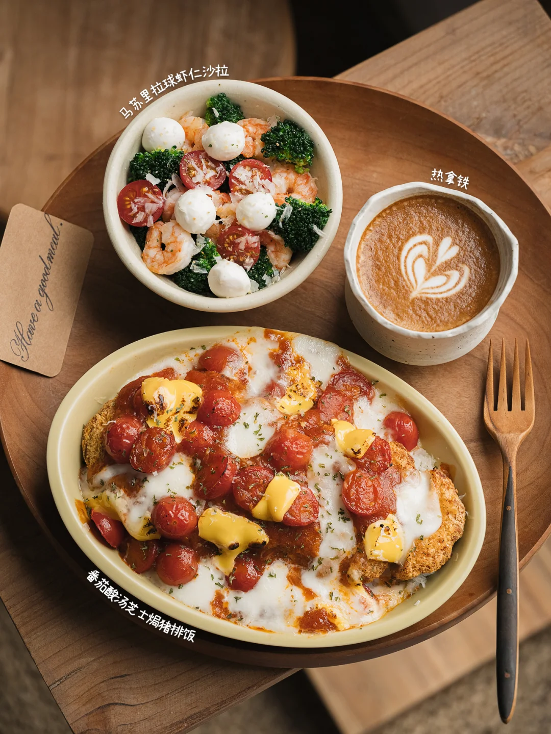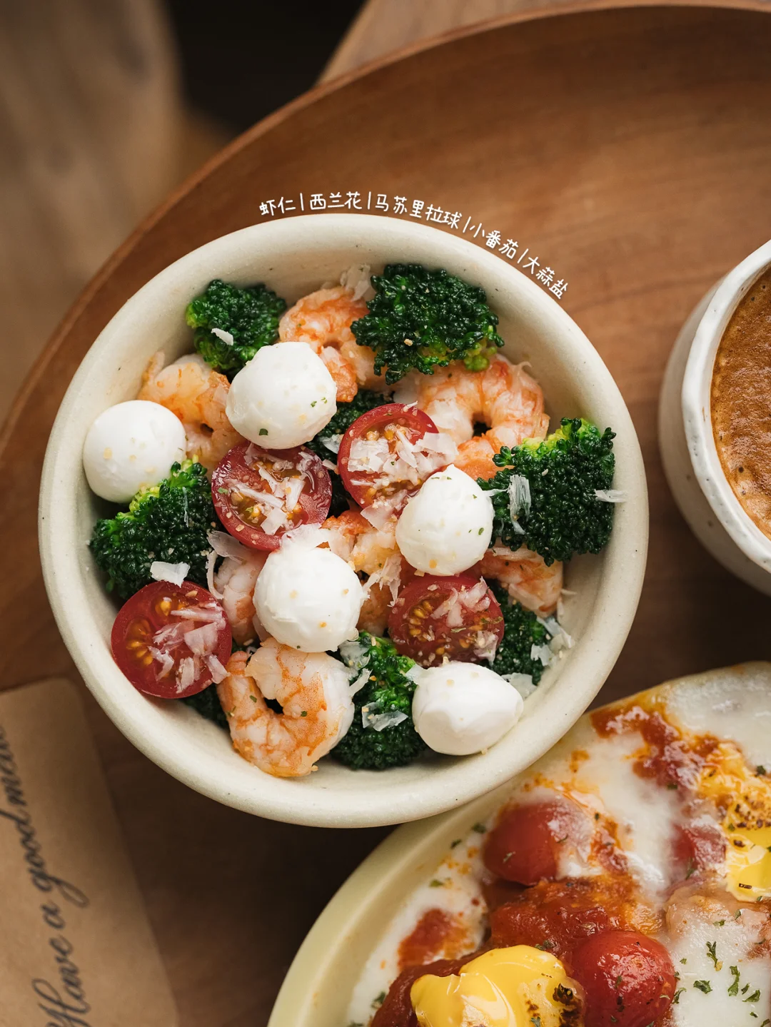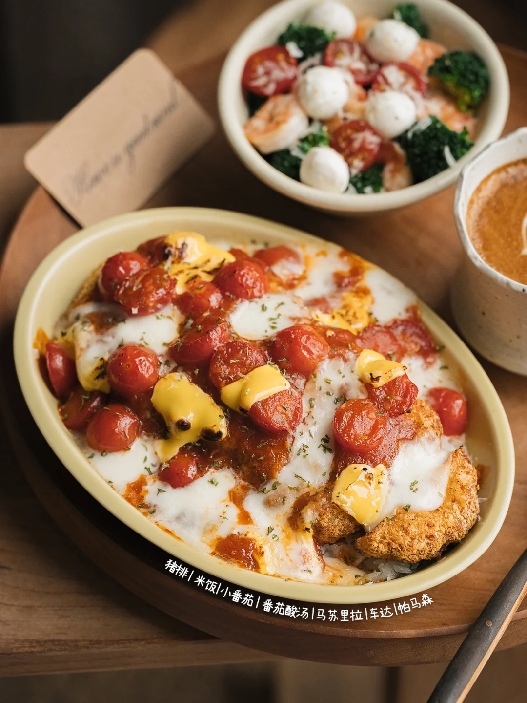 ❷和番茄及芝士球摆盘,加大蒜盐和芝士碎