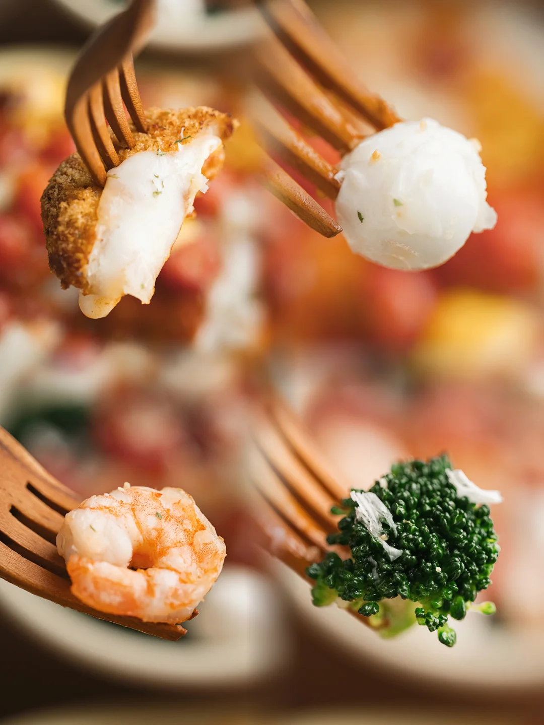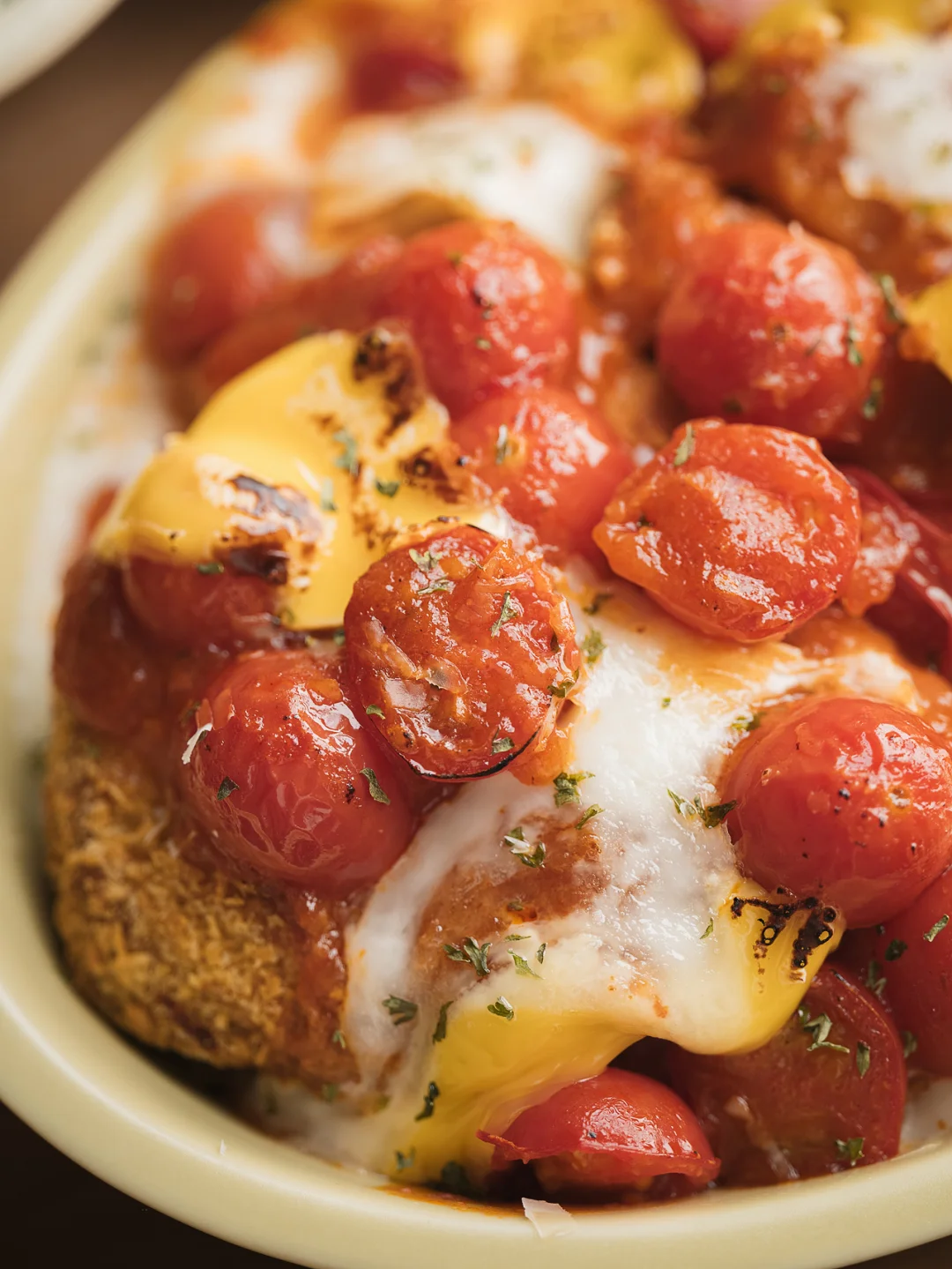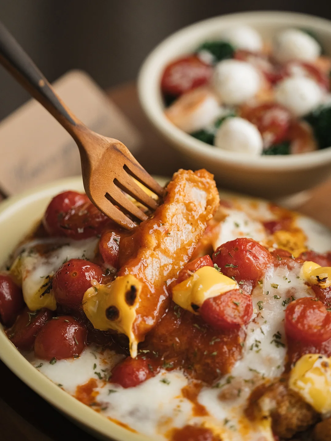 ❷和番茄及芝士球摆盘,加大蒜盐和芝士碎