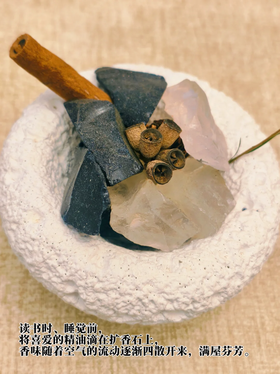 这款晶石香薰我可是一眼爱上的,独特的底托造型搭配形状颜色各异的晶石,再佐以松果肉桂的点缀,一种纯天然的感觉油然而生。读书时、睡觉前,将喜爱的精油滴在扩香石上,香味随着空气的流动逐渐四散开来,满屋芬芳。