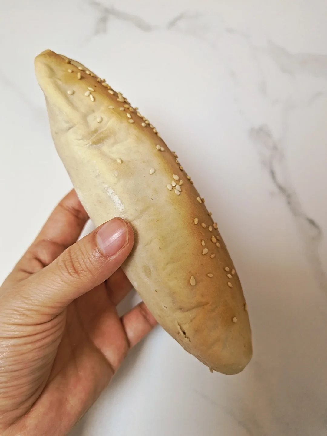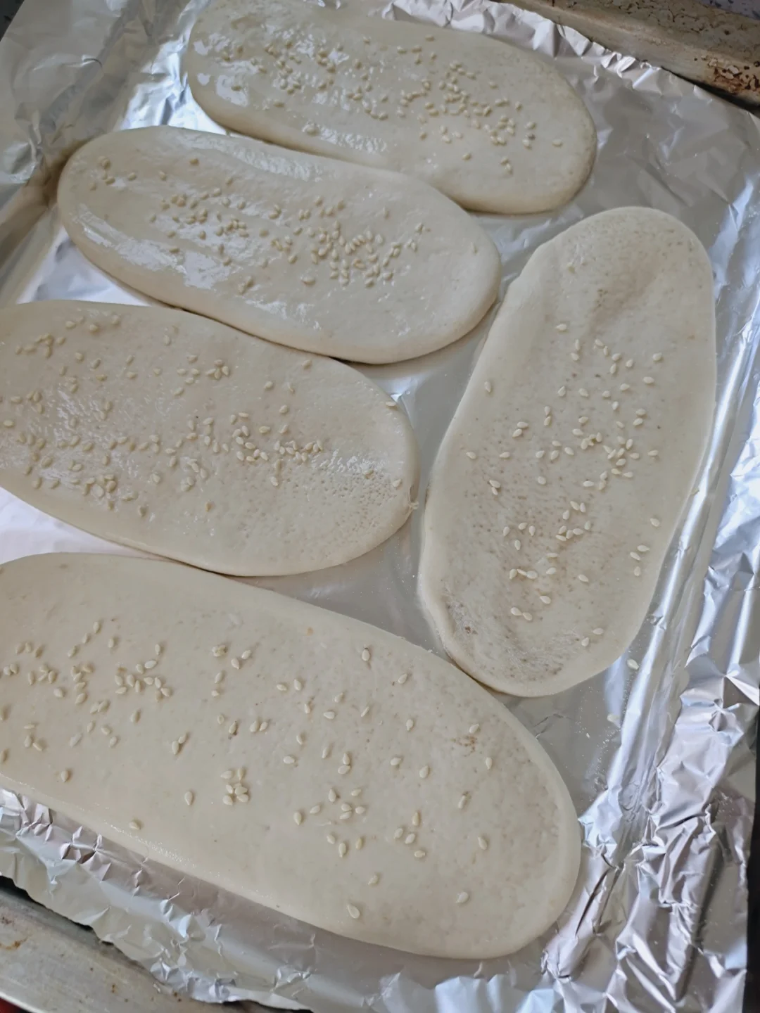 不知道叫什么名字,吊炉烧饼?空心糖饼?还是牛舌头饼?反正就是好吃,自己做很简单哦! 🌈300克普通面粉,160克水,1克盐,10克玉米油,活成光滑的面团,醒30分钟。 🌈小碗里放入适量白砂糖和一点点面粉,混合均匀。面团分成8等份剂子,手把面团随便捏一下中间厚两边薄,放入糖,收口包紧,用擀面杖轻轻擀成薄一点的牛舌状,表面抹点水,撒白芝麻。 🌈烤箱200预热5分钟,烤15分钟。搞定!和外面一个味道,很好吃。
