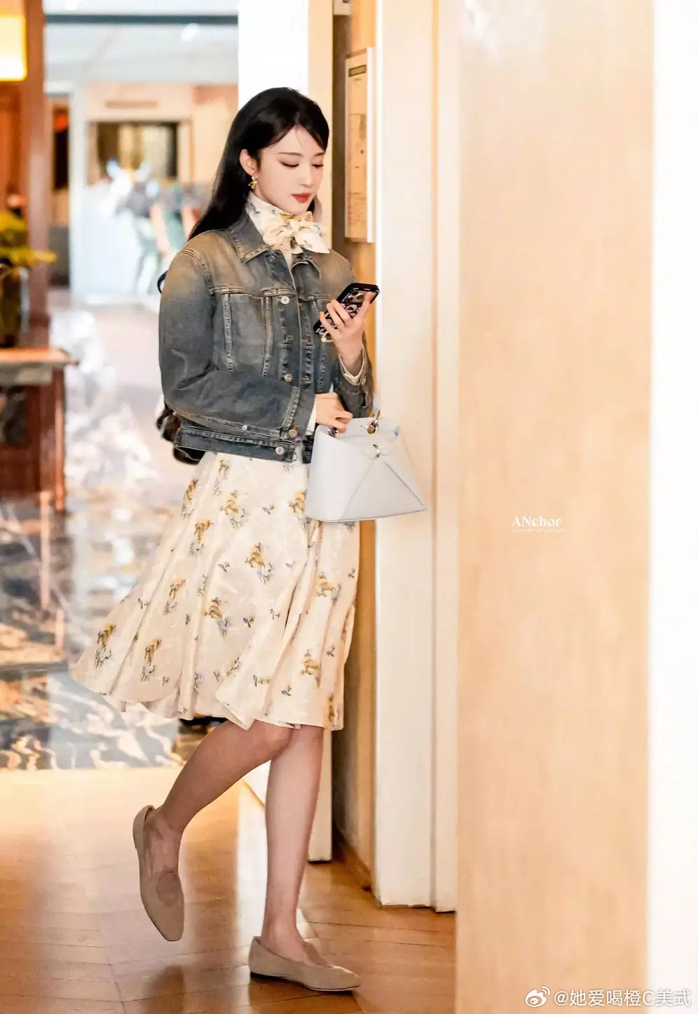 王楚然身着牛仔外套与碎花裙 裙摆轻扬随性优雅