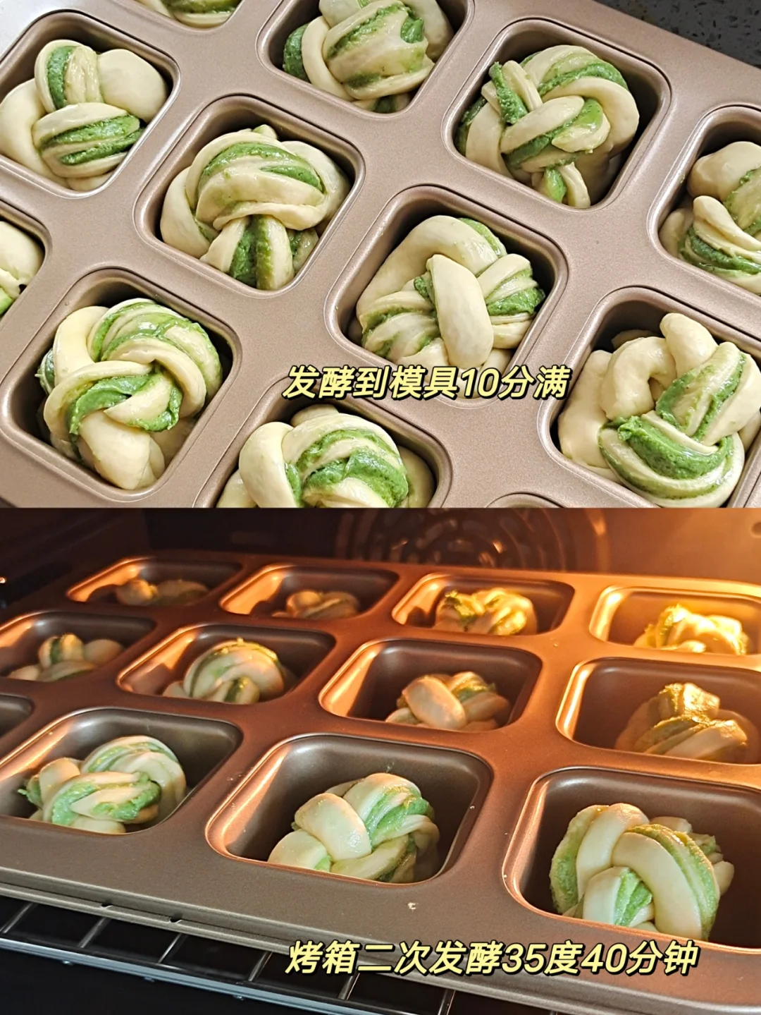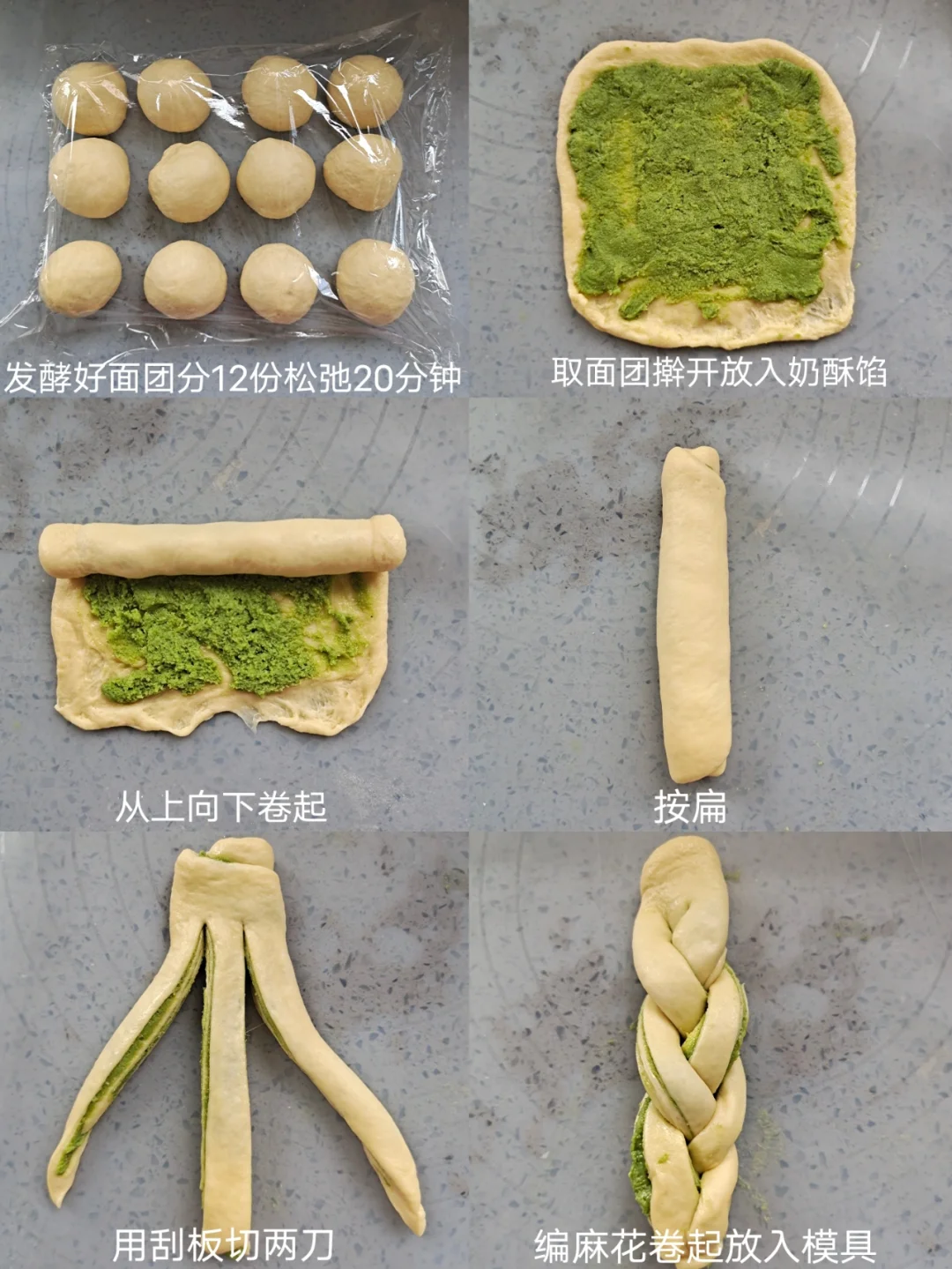 [三R]发酵好的面团分12等份(一个大概39-40克)松弛20分钟,如图取面团擀开,抹上抹茶奶酥馅,从上向下卷起(卷起后可以冰箱冷冻10分钟,方便整形),然后压扁,用刮刀切2刀,编麻花卷起放入模具。