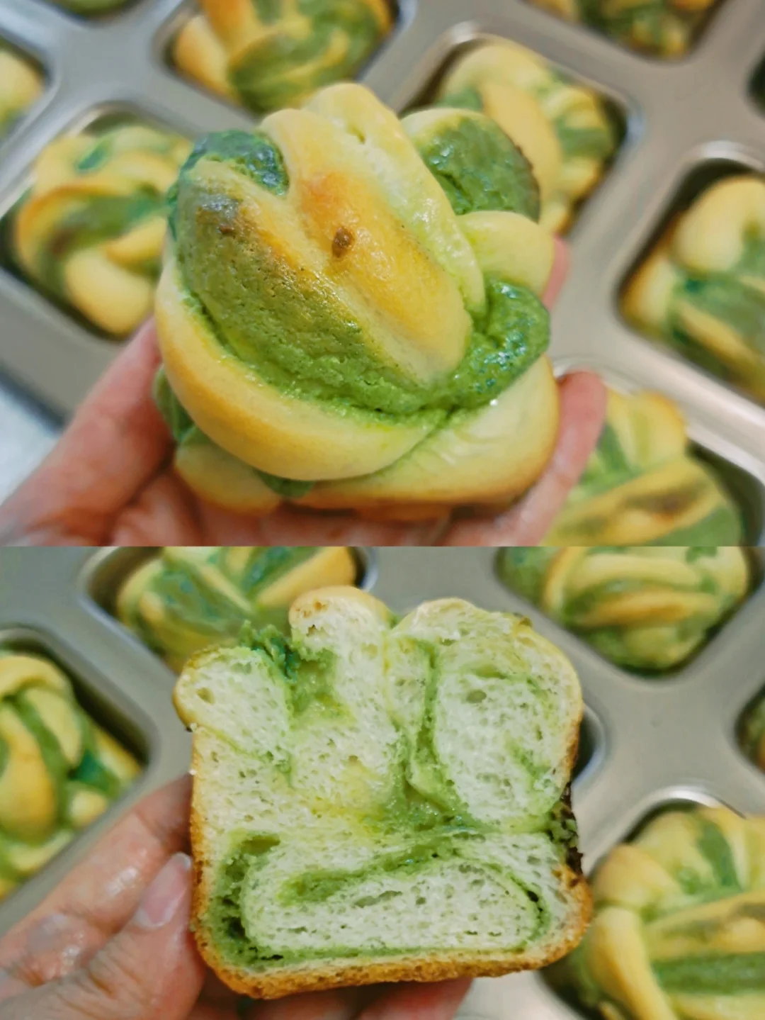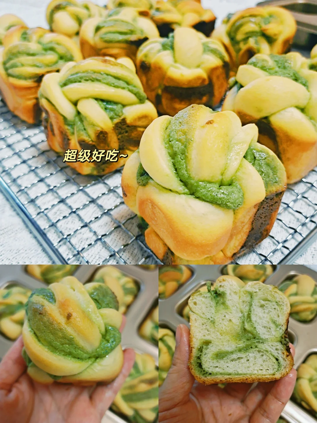 超级好吃的一款迷你小吐司,面包体非常松软,浓郁奶香配着抹茶的茶香,外皮居然意外的还带点焦脆,一口一个,停不下来。