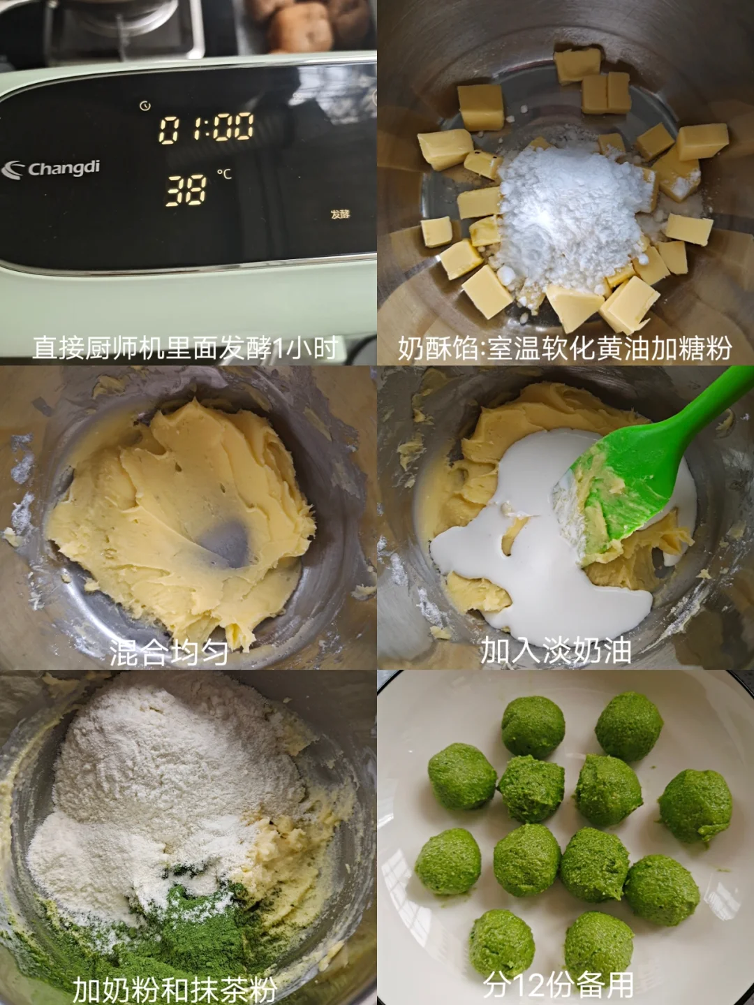 [二R]奶酥馅:室温软化黄油加入糖粉压拌均匀,加入淡奶油搅拌均匀,加入奶粉和抹茶粉拌匀,分12等份备用。