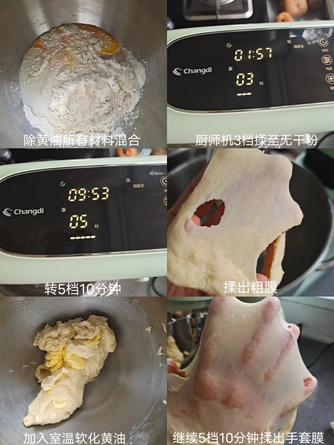 [一R]除黄油以外所有材料混合,厨师机3档2分钟揉至无干粉,再转5档10分钟揉出粗膜,加入室温软化黄油,继续5档10分钟揉至手套膜。面团直接厨师机里面发酵1小时两倍大。