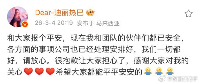 热巴在马来西亚发文给大家报平安,姐姐安全就好,希望所有滞留的同胞也都安全回国,愿世界和平