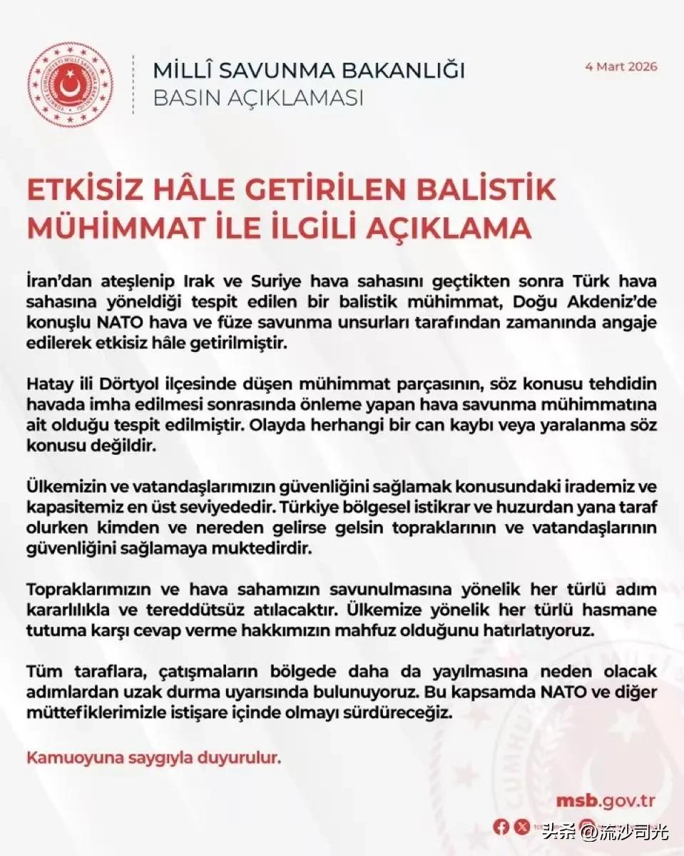 国防部2026年3月4日声明, 关于已升级为紧急状态的军事威胁的说明:一架从伊朗起飞、穿越伊拉克和叙利亚空域后飞往土耳其领空的弹道导弹,已被确认,并由位于地中海东部的北约防空与反导系统及时拦截,使其处于无效状态。在哈塔伊省多尔蒂奥尔区,已确认一枚弹道导弹的部件在被击落之后落入了民用防空系统。此次事件未造成任何人员伤亡或受伤。我们国家和公民的安全是我们的最高优先事项。在维护土耳其地区稳定与安宁方面,我们有能力做到最好。无论来自何方、何时到来,我们都致力于保障土地和人民的安全。我们将果断采取一切必要措施,坚决维护我国的土地和领空主权。我们提醒您,我国有权对任何侵犯领土完整的行为采取相应反制措施。我们呼吁各方避免采取任何可能使冲突在地区内进一步扩大的行动。在此范围内,我们将与北约及其他盟友保持磋商。谨此向公众致以敬意。msb.gov.tr内政部