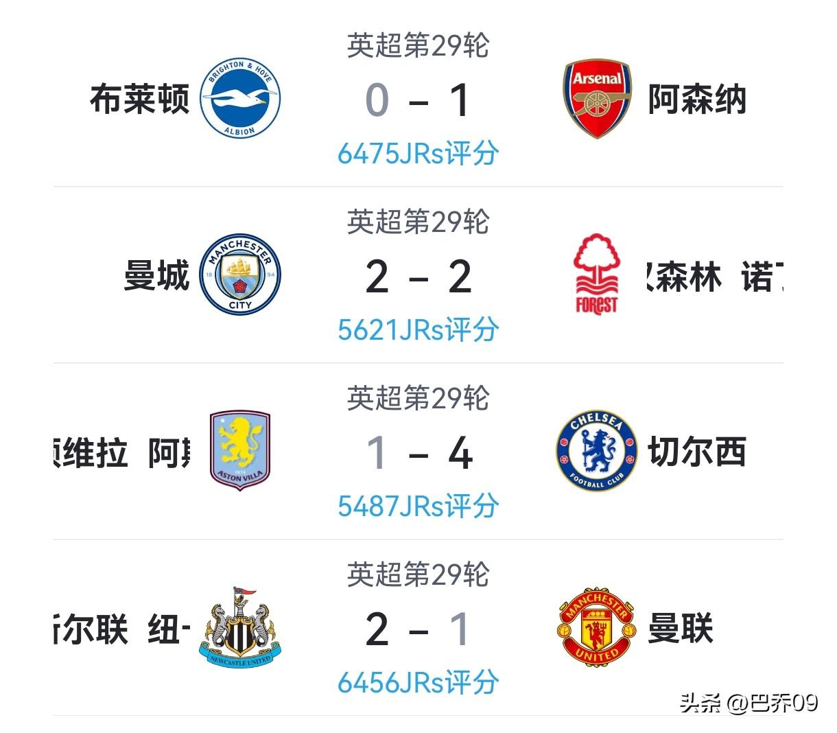 英超第29轮豪门悲喜夜:阿森纳稳胜领跑,曼城爆冷丢分,曼联遭绝杀,切尔西大胜,争冠争四格局剧变 阿森纳1-0布莱顿 英超第29轮焦点战,阿森纳客场1-0小胜布莱顿,延续强势领跑姿态。开场第9分钟,萨卡迎来里程碑时刻,内切射门经折射入网,打入全场唯一进球,帮助球队早早确立领先优势。此后枪手稳守反击,防线众志成城,门将拉亚多次化解险情,加布里埃尔贡献关键门线解围,力保城门不失。全场比赛阿森纳控球与节奏掌控到位,虽未扩大比分,但防守滴水不漏,将胜势保持到终场。此役取胜后,阿森纳豪取联赛三连胜,在多赛一场的情况下领先曼城7分,争冠主动权彻底握在手中。萨卡300场里程碑破门成为佳话,球队攻防体系成熟稳健,后续赛程只要保持稳定,夺冠希望极大。布莱顿全场进攻乏术,未能制造致命威胁,主场落败后保级压力依旧严峻。 曼城2-2诺丁汉森林 曼城主场迎战诺丁汉森林,爆出本轮最大冷门,2-2战平对手,争冠节奏严重受挫。比赛中蓝月亮两度领先均被顽强扳平,塞梅尼奥与罗德里先后破门,本有望全取三分,但防守端接连出现漏洞。吉布斯·怀特脚后跟巧射、安德森禁区外远射世界波,两次将比分追平,让曼城主场拿三分的愿望落空。末段曼城疯狂反扑,萨维尼奥近距离射门被门线解围,错失绝杀良机。这场平局终结了球队此前的连胜势头,在争冠关键阶段丢分,直接导致与阿森纳的差距被拉大。瓜迪奥拉的球队进攻效率下滑,防线稳定性不足,面对保级队的铁血防守办法不多。诺丁汉森林展现极强韧性,抢下宝贵1分,保级希望大增,曼城则陷入被动,争冠形势骤然紧张。 纽卡斯尔联2-1曼联 曼联客场挑战纽卡斯尔联,遭遇卡里克执教后的首场败仗,1-2被对手绝杀,争四前景蒙上阴影。比赛过程跌宕起伏,纽卡上半场少打一人,陷入被动局面,但球队斗志不减。第48分钟戈登制造点球并亲自命中,率先打破僵局。曼联迅速回应,卡塞米罗接B费定位球传中头球破门,扳平比分。正当外界以为红魔将稳住局势时,第90分钟奥苏拉轰出世界波完成绝杀,全场沸腾。曼联全场控球占优却效率低下,进攻端办法不多,防守端注意力不集中,终场前崩盘。此役失利终结了球队近期不败纪录,积分停滞不前,在争四集团中优势缩水。纽卡以少打多仍能取胜,展现强悍主场战斗力,奥苏拉绝杀成为经典时刻。曼联后续需快速调整,否则欧冠资格争夺将愈发艰难。 维拉1-4切尔西 切尔西客场4-1大胜阿斯顿维拉,迎来一场酣畅淋漓的胜利,强势冲击积分榜上游。佩德罗状态火热,上演帽子戏法,成为本场最大功臣,帕尔默也打入一球,蓝军进攻端全面开花。维拉主场作战却防线崩盘,防守漏洞百出,难以限制切尔西的快速反击与边路冲击。全场比赛切尔西战术执行到位,传球流畅,进攻多点开花,防守端稳健有序,完全掌控比赛走势。佩德罗的高效破门、帕尔默的灵动跑位,让维拉防线顾此失彼。此役大胜后切尔西积分大幅提升,排名跃升至第五,与前四差距缩小,争四希望重燃。维拉主场惨败,攻防两端均暴露问题,后续需及时修补漏洞。切尔西在联赛中逐渐找回状态,年轻球员成长迅速,球队士气高涨,有望在最后阶段冲刺欧冠资格。
