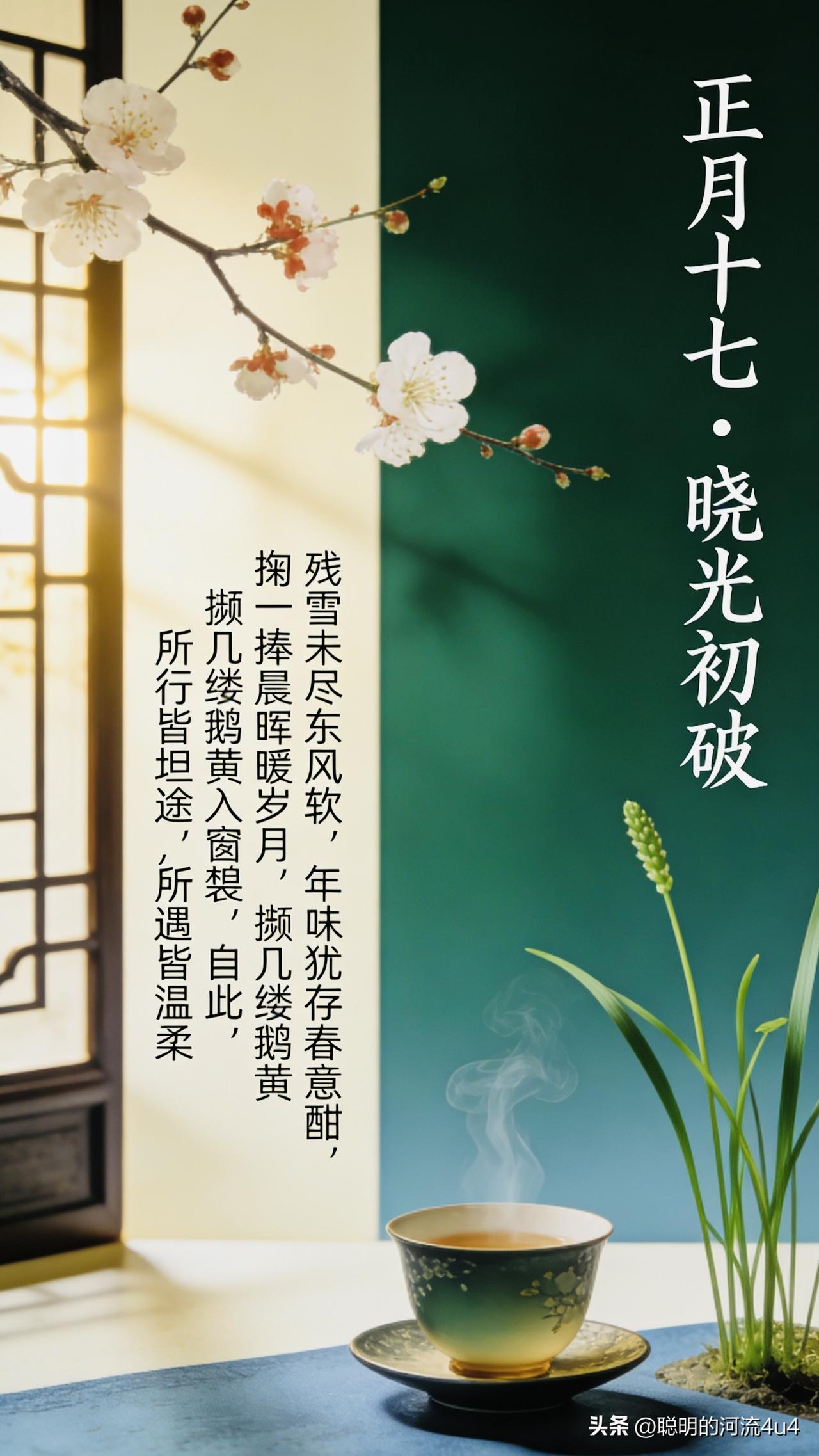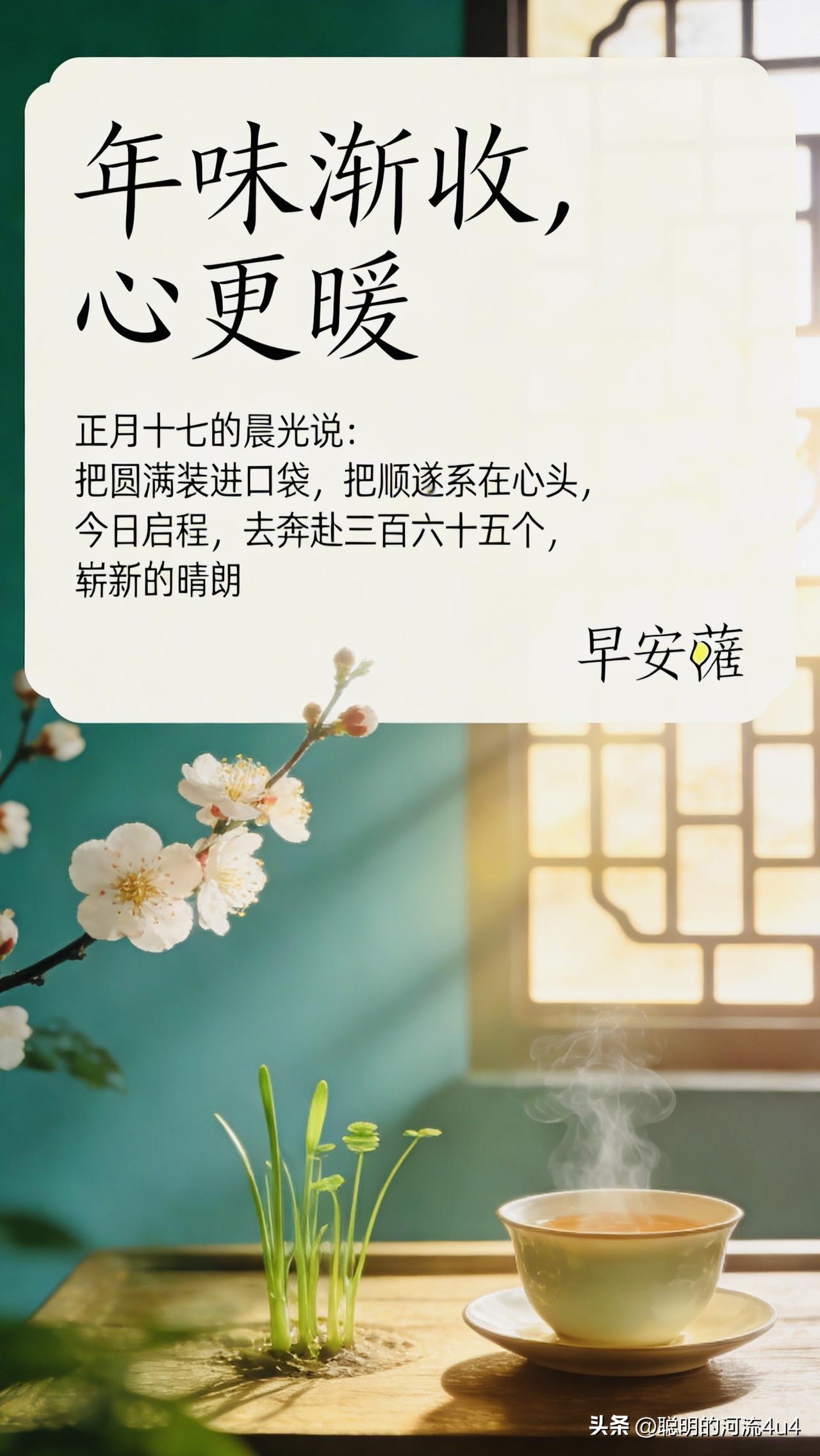 [微风]💐🌞💫🌻☕️🌷🌿 正月十七的晨光 为您铺开新卷, 愿这抹曦暖融化昨日霜寒。 年味渐收心更暖, 春意初萌梦正酣。 将十五的圆满藏进衣兜, 把十六的顺遂系在襟前, 从此步履所至皆坦途, 目光所及尽清欢。 愿您今日推窗遇见第一枝鹅黄, 启程奔赴三百六十五个晴朗, 怀揣烟火里的踏实, 手握星辰般的信念。 早安,且行且歌岁岁安。