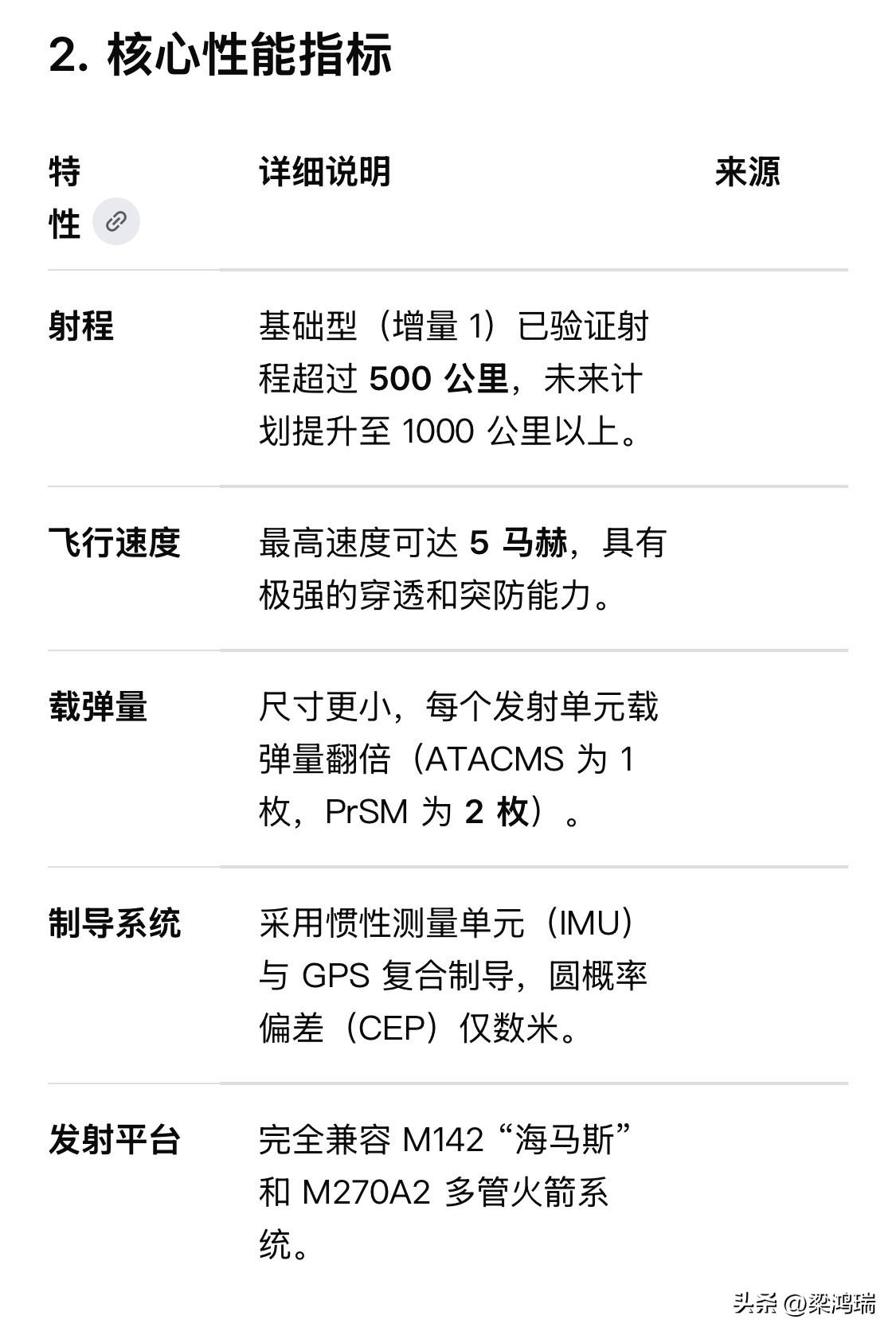 突发新闻:美国首次在针对伊朗的实战中使用了其新型精确打击导弹(PrSM)。 该武器系统是新一代地对地弹道导弹,旨在取代老旧的ATACMS导弹。 美国现已将其部署用于从HIMARS发射器对伊朗目标进行纵深打击。 它的射程超过 500 公里(相比之下,HIMARS 的射程为 300 公里),未来版本计划达到 1000 公里。 有效载荷包含一枚 200 磅(91 公斤)高爆破片单体弹头! 美国新型精确打击导弹(Precision Strike Missile,简称 PrSM)是美国陆军研发的新一代地对地战术导弹系统,旨在取代服役超过 30 年的陆军战术导弹系统(ATACMS)。 1. 实战动态 (截至2026年3月) 根据美国中央司令部发布的最新消息,PrSM 已于 2026 年 3 月初在美军针对伊朗的军事行动中完成了首次实战投入。实战画面显示该导弹由 M142 “海马斯” (HIMARS) 火箭炮系统发射。 2. 核心性能指标(见附表) 3. 主要升级阶段(Increment) PrSM 计划通过分阶段升级实现更广的作战能力: 增量 1 (Increment 1):目前已交付并实战化的基础型号,主要用于打击陆上固定目标。 增量 2 (Increment 2):开发多模式导引头(射频+红外),使其具备打击移动目标及反舰的能力。 后续阶段:重点研发吸气式推进技术,旨在将射程推向 1000 公里级别。