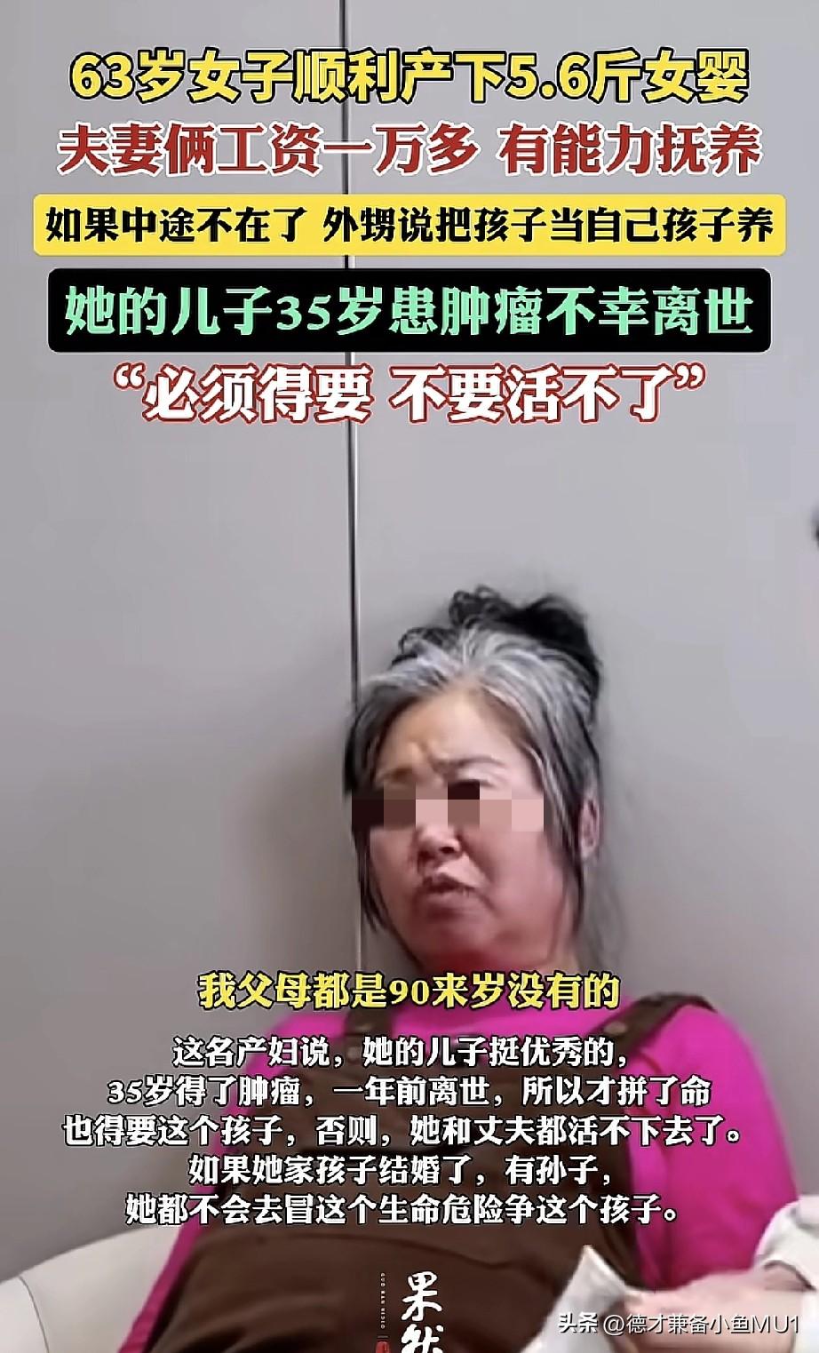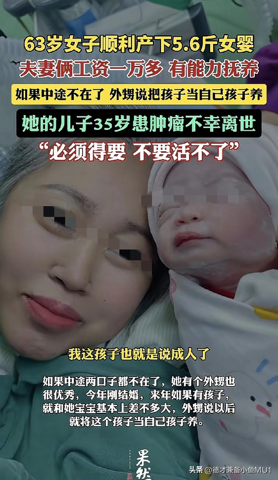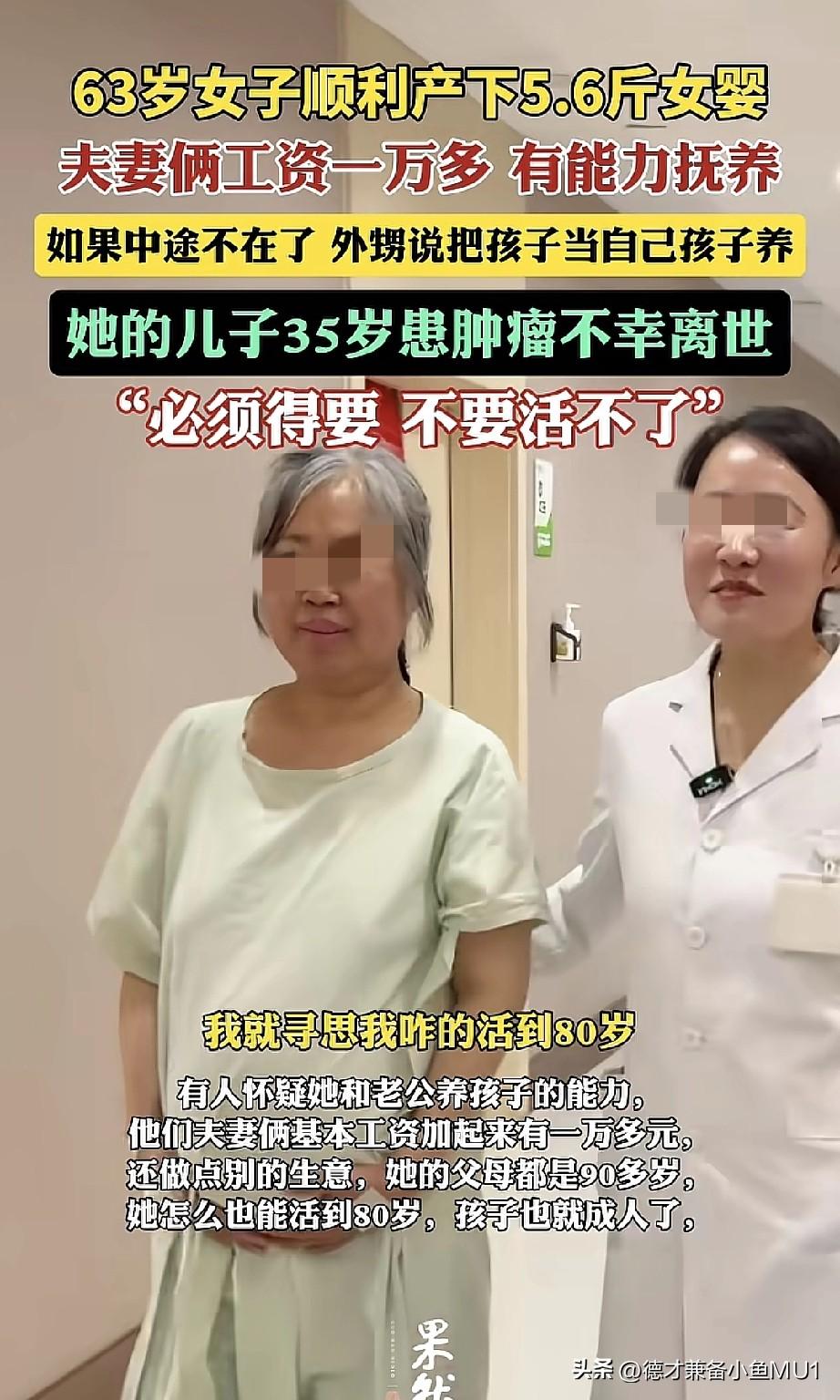 63岁女子成功产下一名5.6斤重的女婴。 她失独后再要个孩子可以理解,这样人生好歹有个盼头,况且人家有能力抚养,还有外甥愿意搭把手,挺好的。反正到了这个岁数都是带孩子,不带自己的孩子,也是带孙子,就当带孙子了。 怎么说呢,其实也能理解,但总觉得这对孩子不太好。唉,等孩子上初中,父母都七老八十了,孩子不会自卑吗?孩子上初中时,万一父母不在了,孩子能不难过吗?将来连个能商量事儿的人都没有,这孩子的人生和别的孩子好像不太一样啊!孩子刚成年,父母就不在了,孩子也会痛苦。 其实父母是为了摆脱痛苦才生了孩子,却无形中把痛苦转嫁给了孩子,没什么意义。能理解她的心情,但对这个新生命来说太不公平了。从孩子上小学起,就需要家长花大量时间和精力陪伴,帮孩子完成生活、学习以及学校布置的任务,后面还有初高择校、就业等问题,孩子可能都没人管! 个人不赞成这么做,失独确实令人难过,但这个年纪非要孩子就是自己的执念了。夫妻俩都能健健康康活到80岁吗?要是其中一个生病了,谁来照顾老人和小孩呢。 对此,大家怎么看?