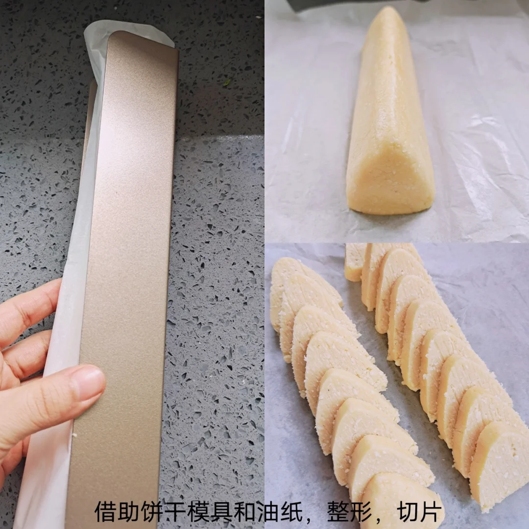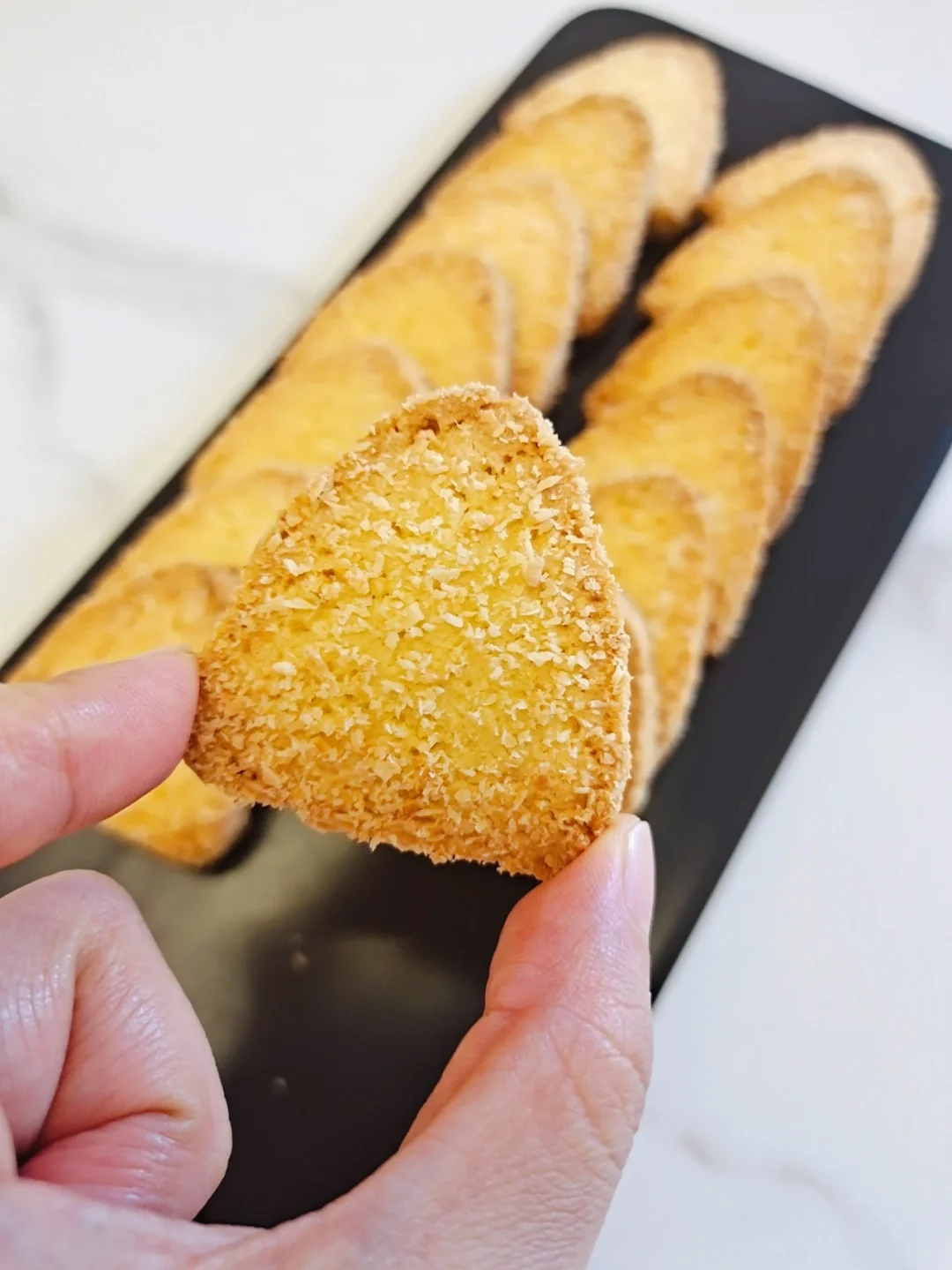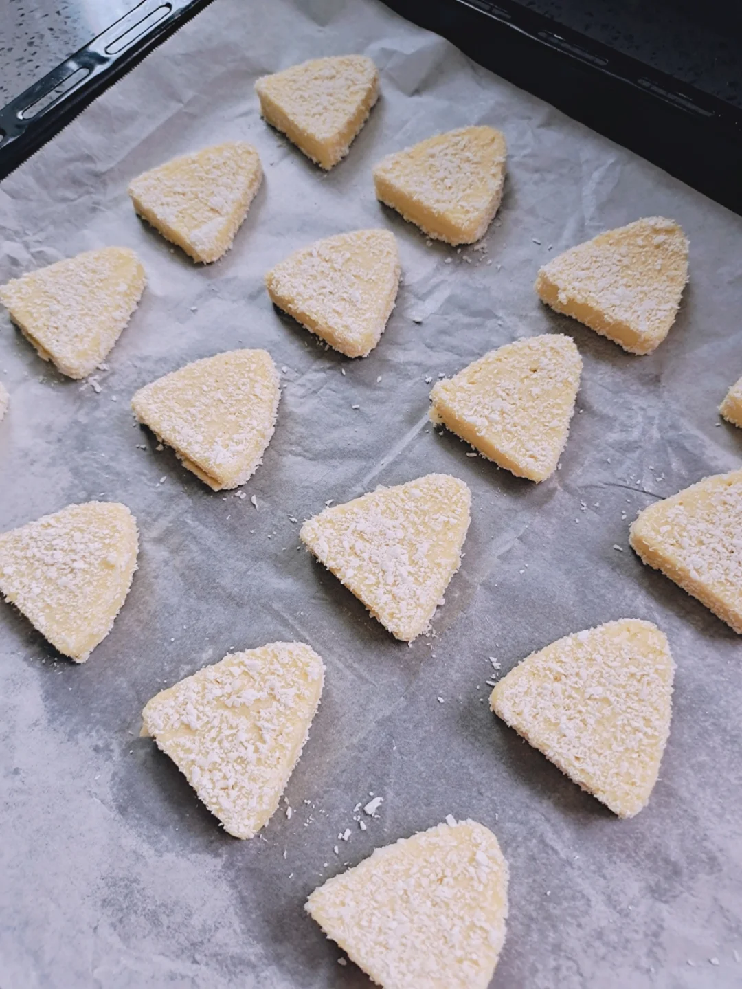 超级好吃的一款小饼干,满屋飘香,酥到掉渣,不甜,配一杯咖啡,妥妥的下午茶。 [彩虹R]黄油60克,糖粉20克,低粉90克,椰蓉30克,蛋液30克。 [一R]室温软化的黄油加入糖粉打发发白。 [二R]分两次加入蛋液搅拌均匀。 [三R]筛入低粉和椰蓉,刮刀翻拌均匀。 [四R]借用模具和油纸整形成三角形,放入冰箱冷冻定型30分钟。 [五R]切片沾取适量椰蓉摆入烤盘,烤箱预热180度,18分钟出炉(每家烤箱脾气不同,大家根据情况调节)