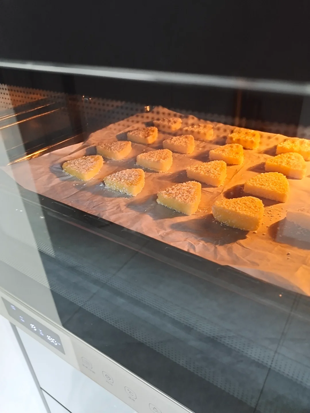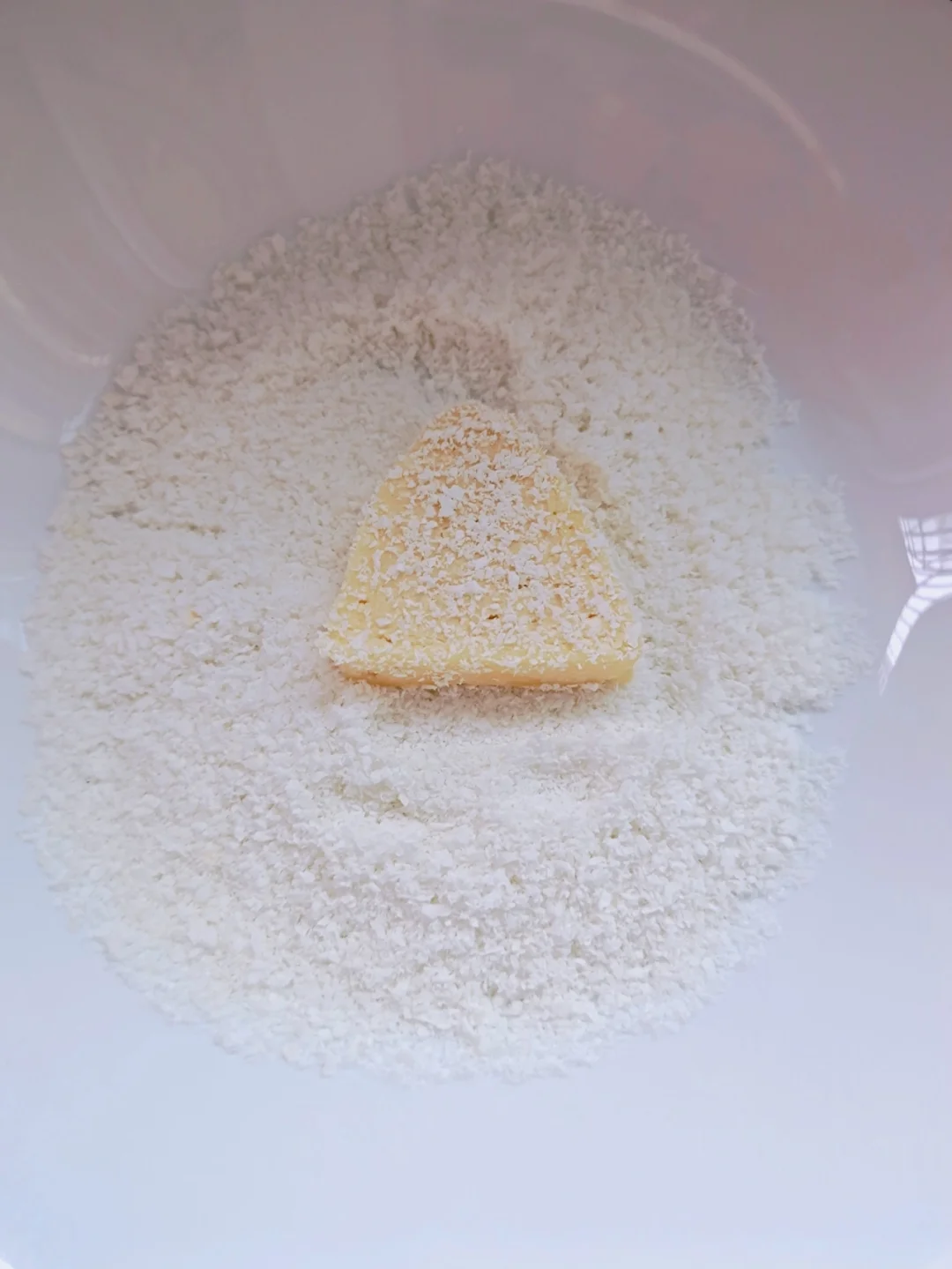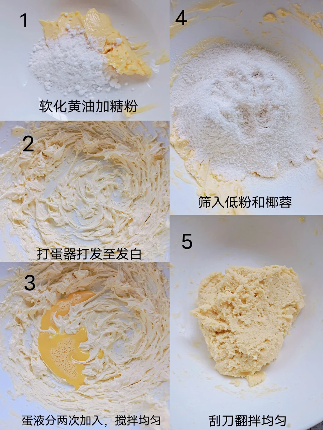 超级好吃的一款小饼干,满屋飘香,酥到掉渣,不甜,配一杯咖啡,妥妥的下午茶。 [彩虹R]黄油60克,糖粉20克,低粉90克,椰蓉30克,蛋液30克。 [一R]室温软化的黄油加入糖粉打发发白。 [二R]分两次加入蛋液搅拌均匀。 [三R]筛入低粉和椰蓉,刮刀翻拌均匀。 [四R]借用模具和油纸整形成三角形,放入冰箱冷冻定型30分钟。 [五R]切片沾取适量椰蓉摆入烤盘,烤箱预热180度,18分钟出炉(每家烤箱脾气不同,大家根据情况调节)