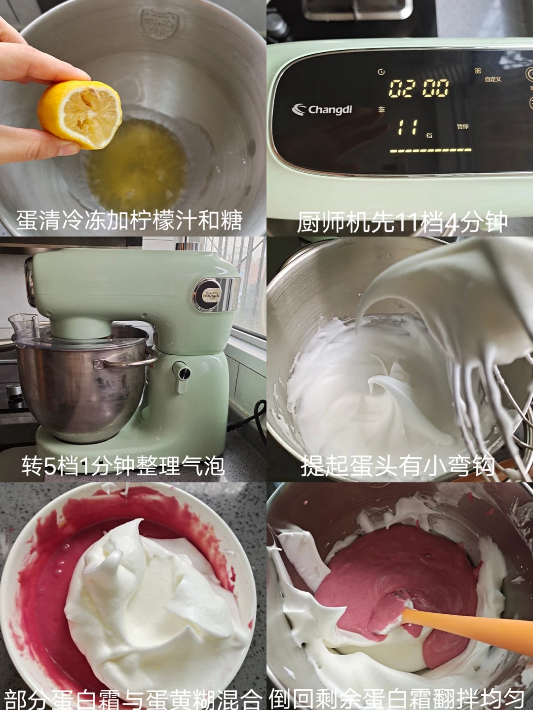 [三R]烤箱150度预热,蛋清冻至冰渣,加入糖和几滴柠檬汁,今天我用长帝小猪厨师机打发蛋清,先11档4分钟,转5档1分钟低速整理气泡,提起打蛋头有小弯钩即可。(如果打蛋器打发先高速,出现纹路转低速整理气泡,只要是低速别担心不会打过的)