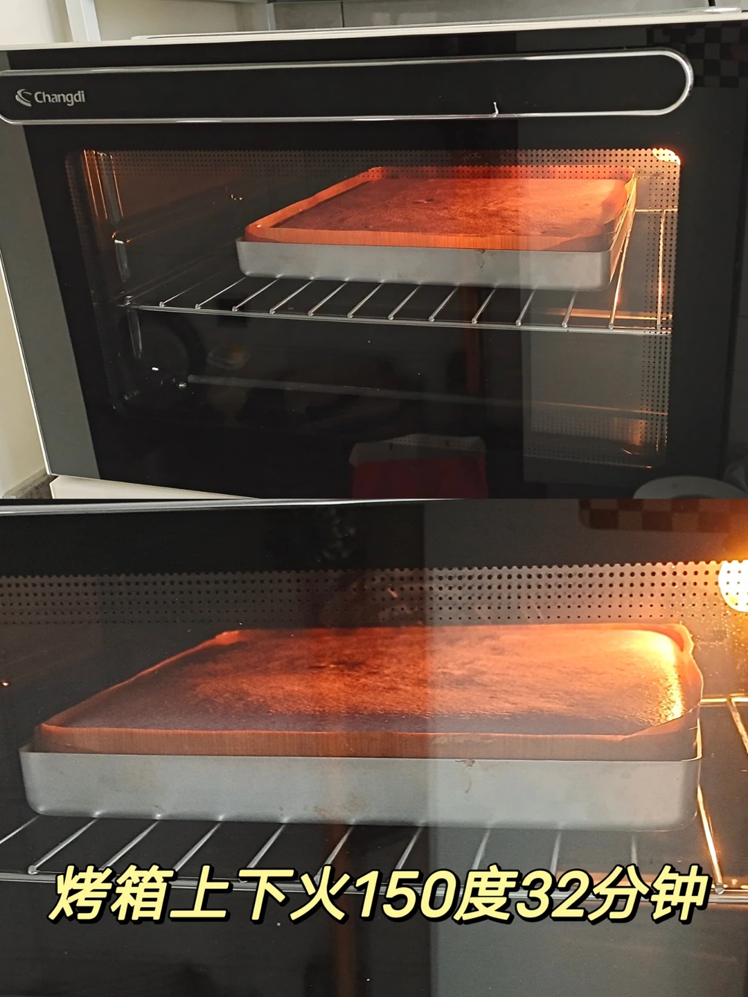 [四R]取三分之一蛋白霜与蛋黄糊混合,轻柔翻拌均匀,再倒回剩余的蛋白霜里面,翻拌均匀。从高处倒入28*28烤盘,整理表面,轻震几下送入烤箱,150度32分钟,出炉后震几下,移到晾网,等手温时撕掉油布。
