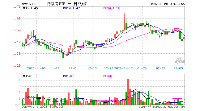 3月5日,物联网ETF(516330)开盘涨0.99%,报1.422元。物联网ETF(516330)重仓股方面,中际旭创开盘涨3.15%,立讯精密涨1.56%,汇川技术涨5.02%,兆易创新涨3.26%,美的集团涨0.58%,中兴通讯涨1.38%,科大讯飞涨2.24%,海康威视涨1.16%,豪威集团涨2.01%,海尔智家涨0.77%。