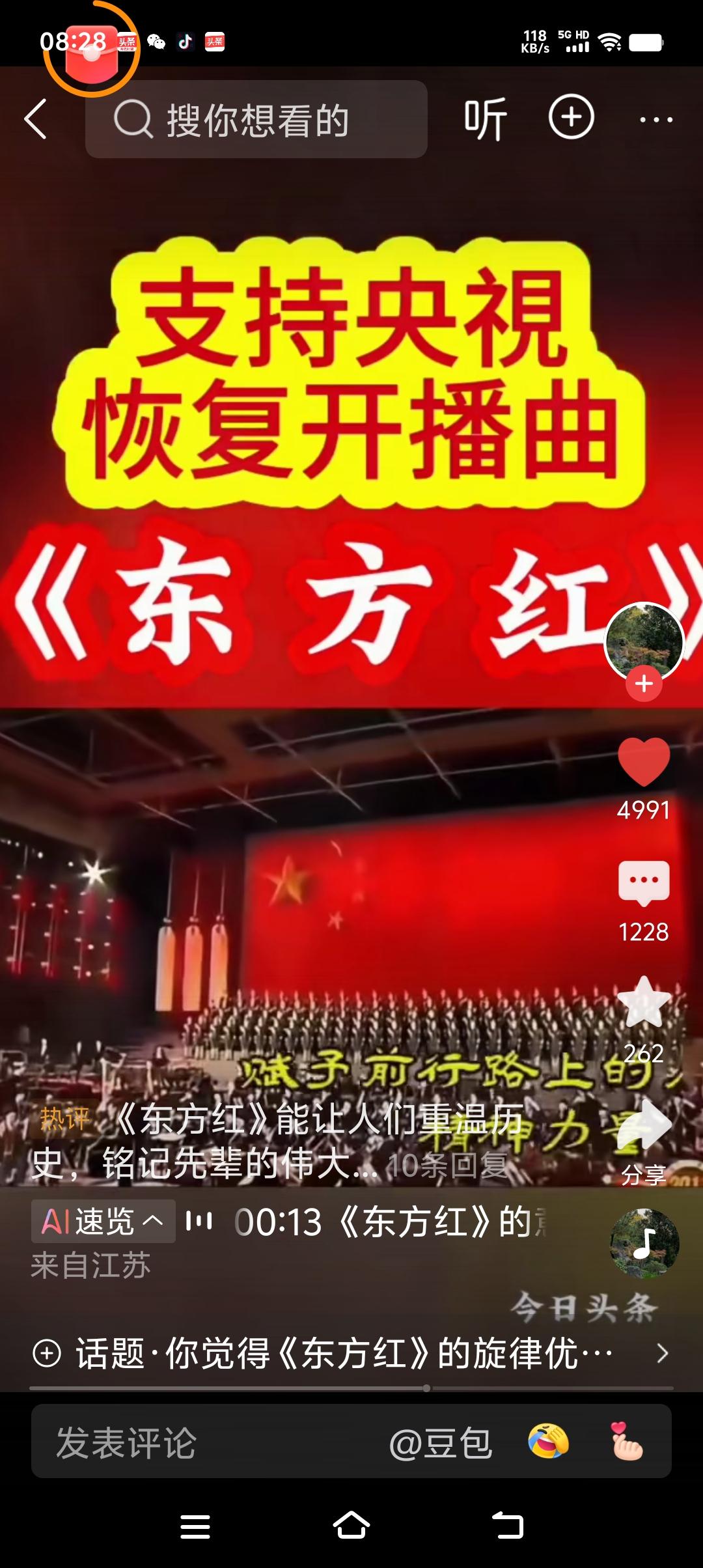 重温央视开播曲《东方红》依旧心潮澎湃,热血沸腾! 1、央视从什么时候开始有开播曲《东方红》的? 1957年7月,正式启用编钟演奏版《东方红》作为固定开始曲,每日清晨乐曲响起。 1945年延安新华广播电台首次播出该曲,1949年开国大典奏响后,后来就成为国家标志性主旋律,1957年确定为广播开始曲。 电视端,央视前身北京电视台在1958年9月2日,北京电视台正式开播,同步沿用《东方红》为开始曲。 有线广播的《东方红》开播曲在“文革后”变更为《义勇军进行曲》! 2、北京电视台也就是中央电视台前身,在1966年“文革”开始后,好多节目做了相当大整改,其中很多原有节目停播了,因为毕竟变更为央视,面对的观众是全国人民,播出信息量也是整个国际国内的,调整是必要的! 开播曲《东方红并不是在北京台转为央视的时间节点变更的,也就是说停播开播去曲《东方红》不是在1978年5月1日 3、1988年3月1日:央视停用《东方红》开始曲,改用新的央视台标音乐。 4、好多人支持现在把央视的开播曲恢复《东方红》乐曲! 这首开播取得恢复会让人们世世代代,时刻铭记革命先辈为了打江山立下的丰功伟绩,不忘本,传承红色基因,珍惜来之不易的太平盛世! 看中东局势体味当下比蜜还还甜的幸福生活,越发怀念抛头颅洒热血的老一辈革命家,革命先烈,当代人只有不忘初心,牢记使命,砥砺前行才能捍卫我们的红色政权! 《东方红》世代传唱经久不衰,红色基因代代相传,永远兴旺! 朋友们你支持央视开播去恢复《东方红》乐曲吗?
