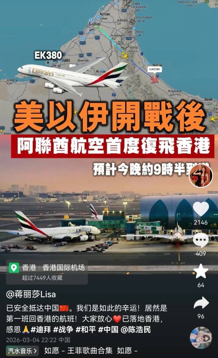 陈浩民说,他们没有找代购机票的人,也没有找任何第三方渠道,找什么关系,全靠老婆的“神仙手”才买到了票。蒋丽莎说,她打开携程后,意外看到有4日飞香港的机票,心想怎么可能有啊,点进去真的就有,就先给父母买了两张,后来过了一段时间才又买到两张,一家四口都能飞回香港,真的很惊喜,迪拜飞香港的普通机票票价1万元左右,没有网上传的什么几十万几百万一张。只听说公务舱二三万一张票,有个旅客抢了10多张花了30多万元。