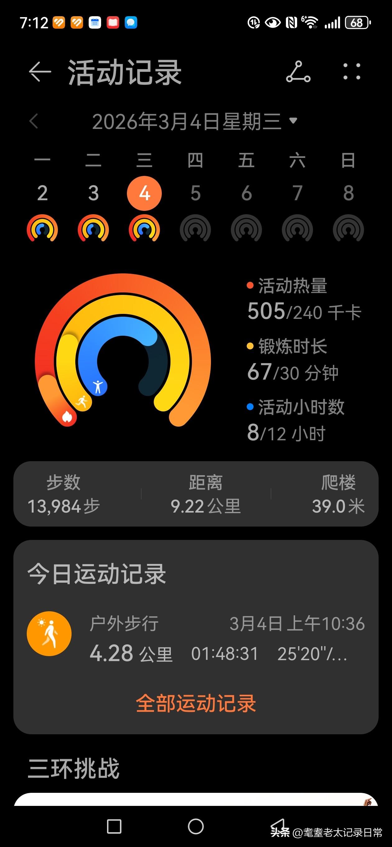 跟着励院士和石春健老师的视频学习慢跑三个月,结合自己的自身情况,感觉腿部肌肉加强,心情越来越快乐[比心]感谢这位两位老师的分享[比心]下面图片是2026年3月4日,我的华为手机记录的慢跑和步行的成绩,锻炼不是为了追求配速和距离,而是为了追求实实在在的健康和运动健身慢跑不受年龄限制 83岁慢跑现身说法