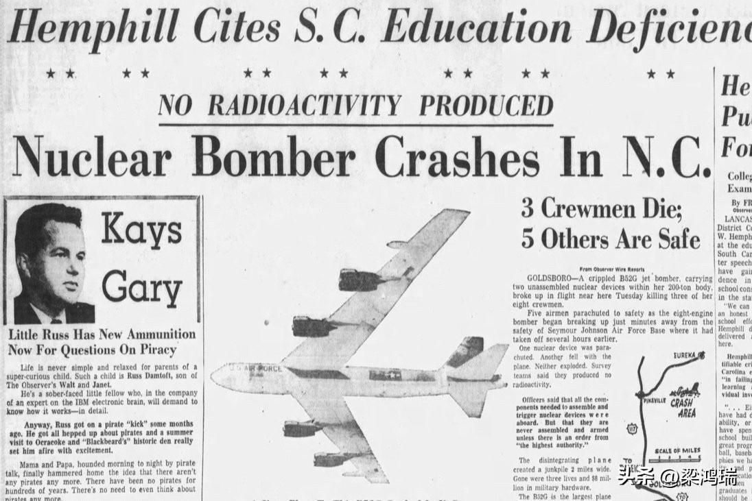 1961年1月24日凌晨,美国空军一架携带两枚Mk 39热核炸弹的B-52G轰炸机因右翼燃油泄漏在北卡罗来纳州戈尔兹伯勒上空解体坠毁。 核弹状态: 第一枚核弹:由于降落伞成功打开,该弹相对完好地着陆。解密文件显示,该弹的4道安全机制中有3道失效,仅靠最后一个手动低压开关(Safe/Arm开关)处于“安全”位置才阻止了爆炸。 第二枚核弹:以自由落体状态高速坠入泥沼并解体,其铀核心至今仍埋在地下深处。 潜在后果:每枚核弹的威力约为400万吨TNT当量(广岛原爆的260倍)。如果爆炸,致命放射性尘埃可能会波及华盛顿、巴尔的摩、费城甚至纽约。 历史定性:这起事故被列为“断箭”(Broken Arrow)事件,即涉及核武器但未酿成战争或核爆的重大事故。
