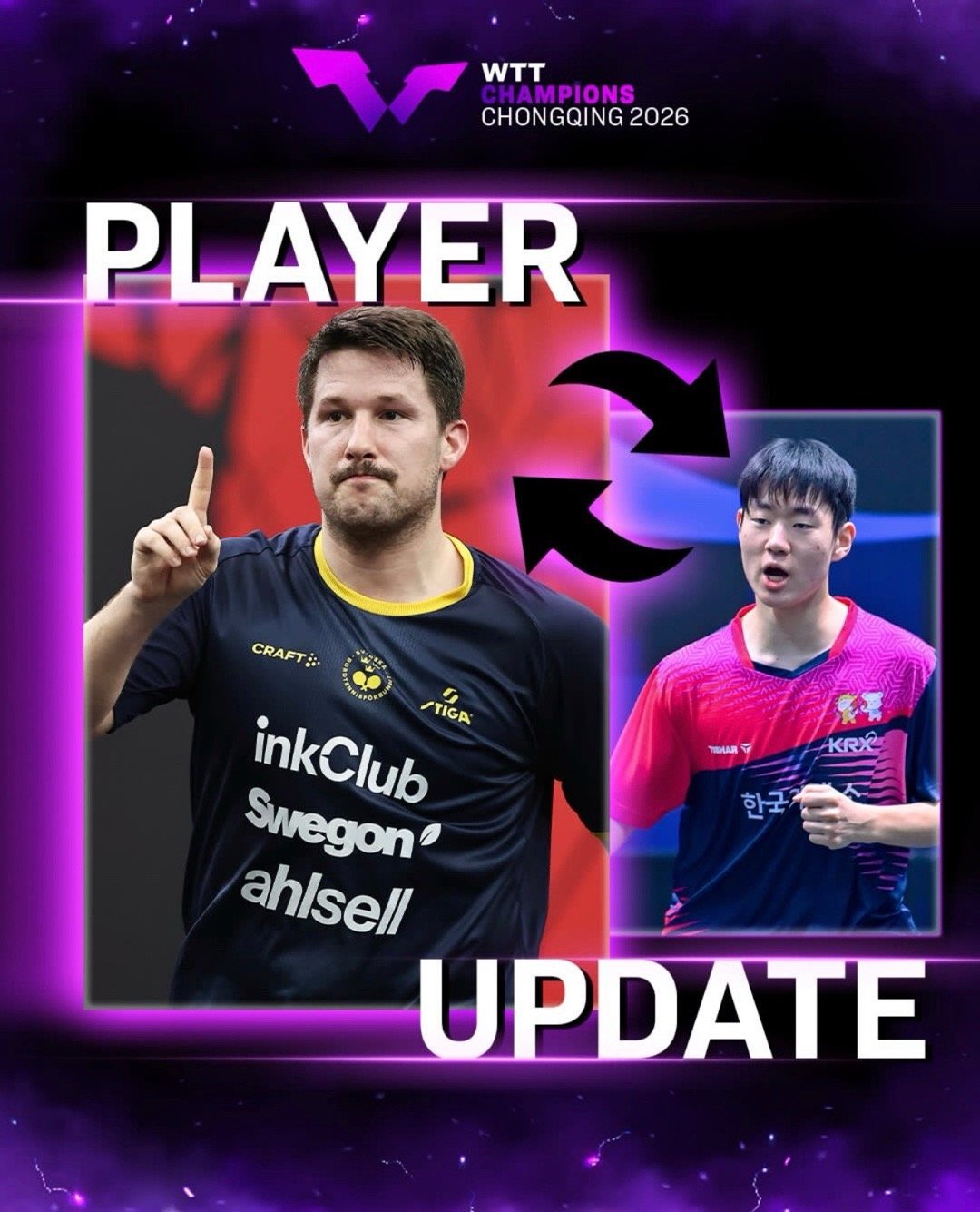 2026wtt重庆冠军赛林诗栋—退赛 陈垣宇—递补(肩伤)张禹珍—退赛 格罗特—递补(颈伤)吴晙诚—退赛 K·卡尔松—递补(腿部拉伤)