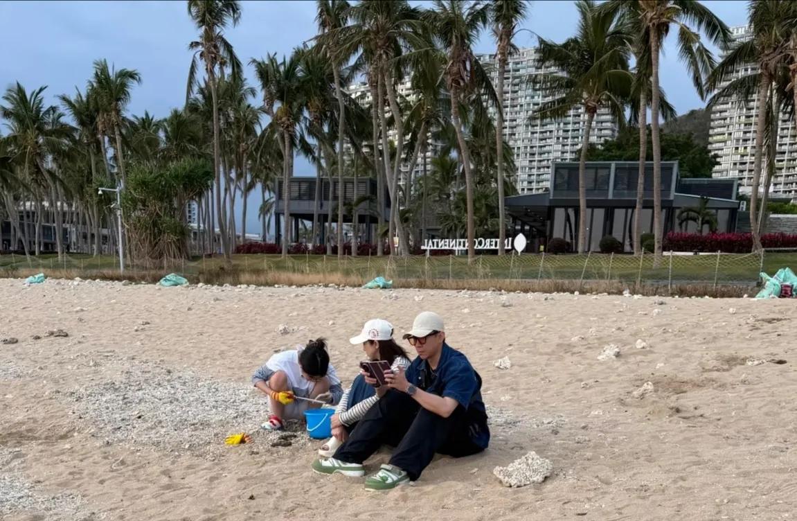 董璇坐在沙滩上, 略显疲惫, 小酒窝过来, 就给小酒窝拍张照, 都懒得站起身来了! 张维伊坐在董璇旁边认真的玩着他的三折叠手机, 所有父母都一样, 带娃时间长了都会累! 累并快乐着!