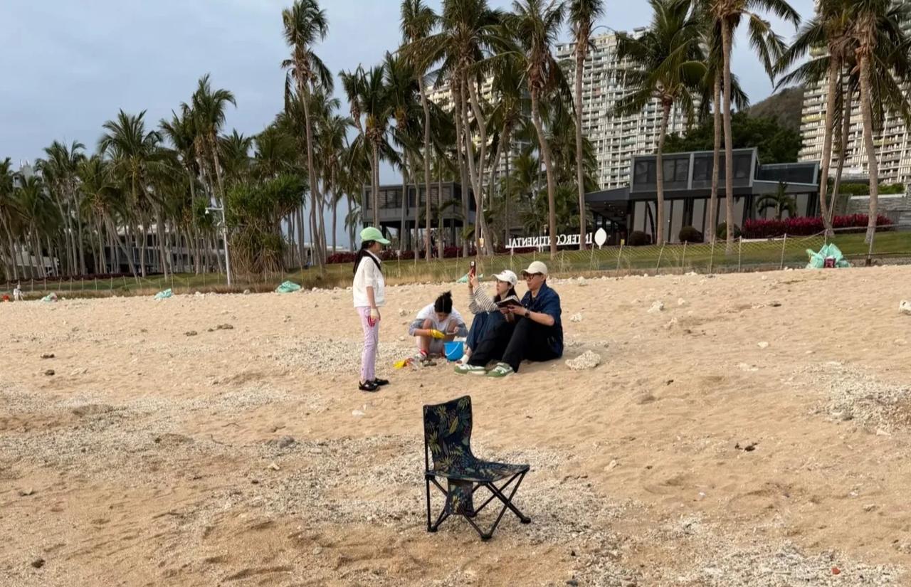 董璇坐在沙滩上, 略显疲惫, 小酒窝过来, 就给小酒窝拍张照, 都懒得站起身来了