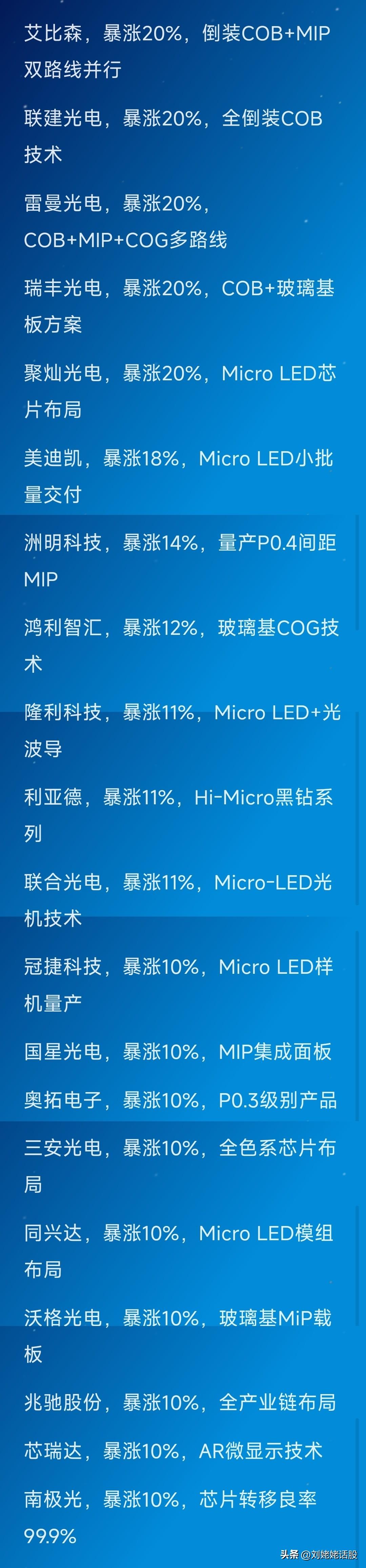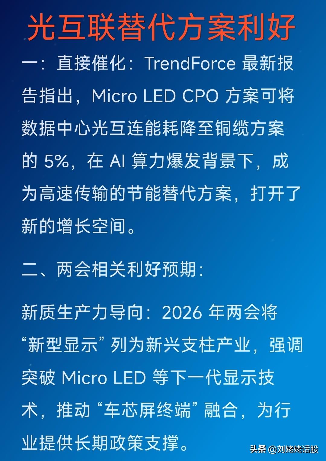 Micro LED CPO“光互连替代”方案呼之欲出,Micro LED概念疯涨。“光互连替代”核心产业链梳理。 关注“刘姥姥”,精彩分享真不少(麻烦亲们:点赞,收藏,分享)。 特别提醒:本文涉及内容及个股,仅供交流与参考,不是荐股,不得以此作为买卖依据,盈亏自负。光模块股 光互连芯片