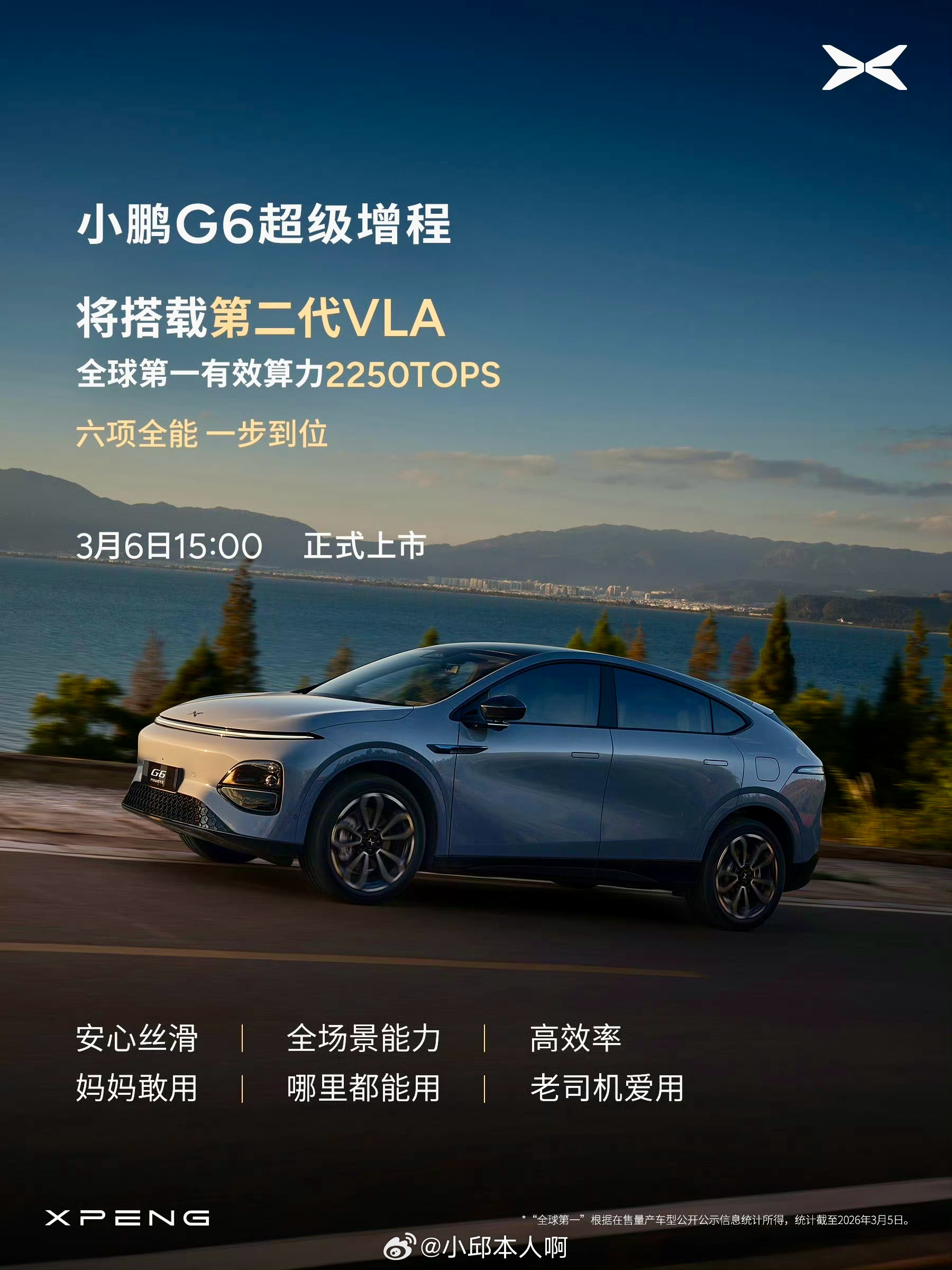车辆配备2250TOPS算力,支持第二代VLA智能驾驶,搭配太极AI底盘与DCC系统,兼顾操控与乘坐舒适。车内空间利用率85.6%,同时配备180km/h爆胎稳行、130km/h AEB刹停等主被动安全功能,整体在续航、补能、智驾、底盘、空间和安全方面均有相应配置。小鹏G6超级增程六项全能一步到位