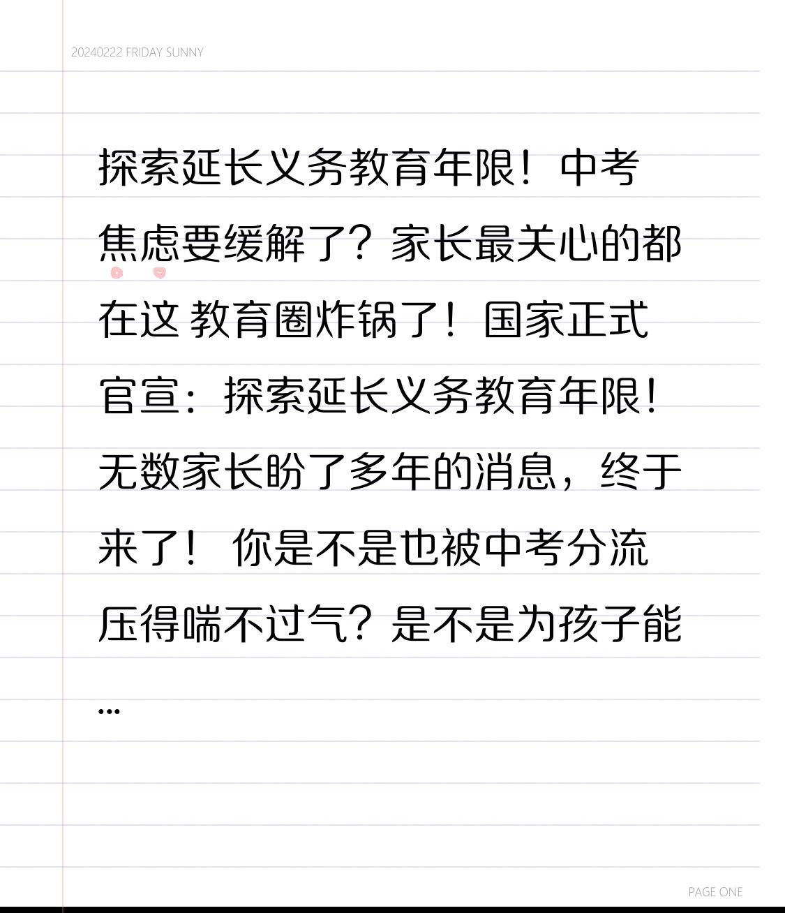 探索延长义务教育年限!中考焦虑要缓解了?家长最关心的都在这 教育圈炸锅了!国家正式官宣:探索延长义务教育年限!无数家长盼了多年的消息,终于来了! 你是不是也被中考分流压得喘不过气?是不是为孩子能不能上普高夜夜失眠?是不是觉得补课费、择校费像一座大山?这条消息,直接关系到每一个家庭、每一个孩子的未来! 从九年到更长年限,不只是数字变化,更是教育公平的大跨步。过去,很多孩子因为几分差距无缘高中,小小年纪就要面对分流;很多普通家庭,为了一张高中学位砸锅卖铁。义务教育延长,意味着更多孩子能安心读书、更多家庭减轻负担,寒门子弟也能稳稳站上起跑线。 大家都以为马上全国推行12年义务教育,关键转折点来了!官方明确是“探索”,不是一刀切、不是立刻全覆盖。会优先在有条件的地区试点,先扩大免费教育范围,再稳步推进;方向上,要么向上覆盖高中,要么向下延伸学前,循序渐进、稳妥落地。 为什么不一步到位?因为我国地域差距大,要兼顾财政、师资、学位,既要解决焦虑,也要保证质量,不搞大水漫灌,不搞形式主义,让改革真正惠及百姓。 这背后,是国家对教育的重视,对民生的回应。减少内卷、降低焦虑、让教育回归育人本质,让每个孩子都有更长的受教育机会,不让家庭被教育成本压垮。 不管是延长到高中,还是覆盖学前,核心都是让教育更公平、更普惠、更有温度。不用再为一分一操场拼命,不用再为升学透支全家,让孩子慢慢成长,让家长安心生活。 教育是最大的民生,公平是最好的礼物。愿每一个孩子都能无忧读书,每一个家庭都能卸下重担,让教育照亮更多普通家庭的未来! 点赞转发,让更多人看到这条好消息,一起期待教育更公平的明天!