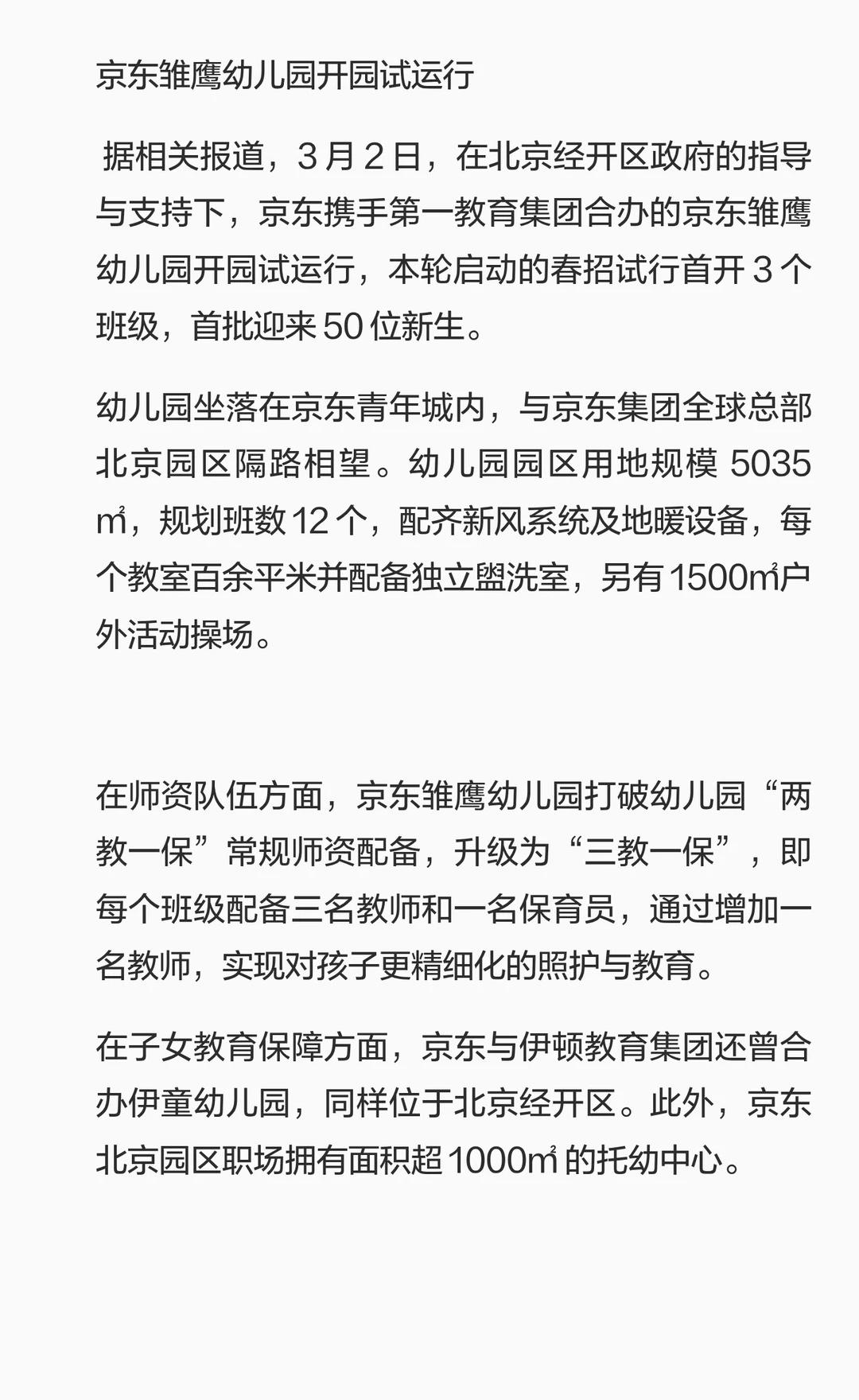 北京经开区京东雏鹰幼儿园开园试运行 京东雏鹰幼儿园开园试运行,首批3个班级迎接50名新生,位于京东青年城,配备新风系统和地暖,提供精细化教育。园区规划12个班,拥有1500㎡户外操场,师资配备“三教一保”。京东 北京妈妈 亦庄 国际幼儿园 让教育自然发生 宝宝上幼儿园 缓解入园焦虑 经开区 走进幼儿园