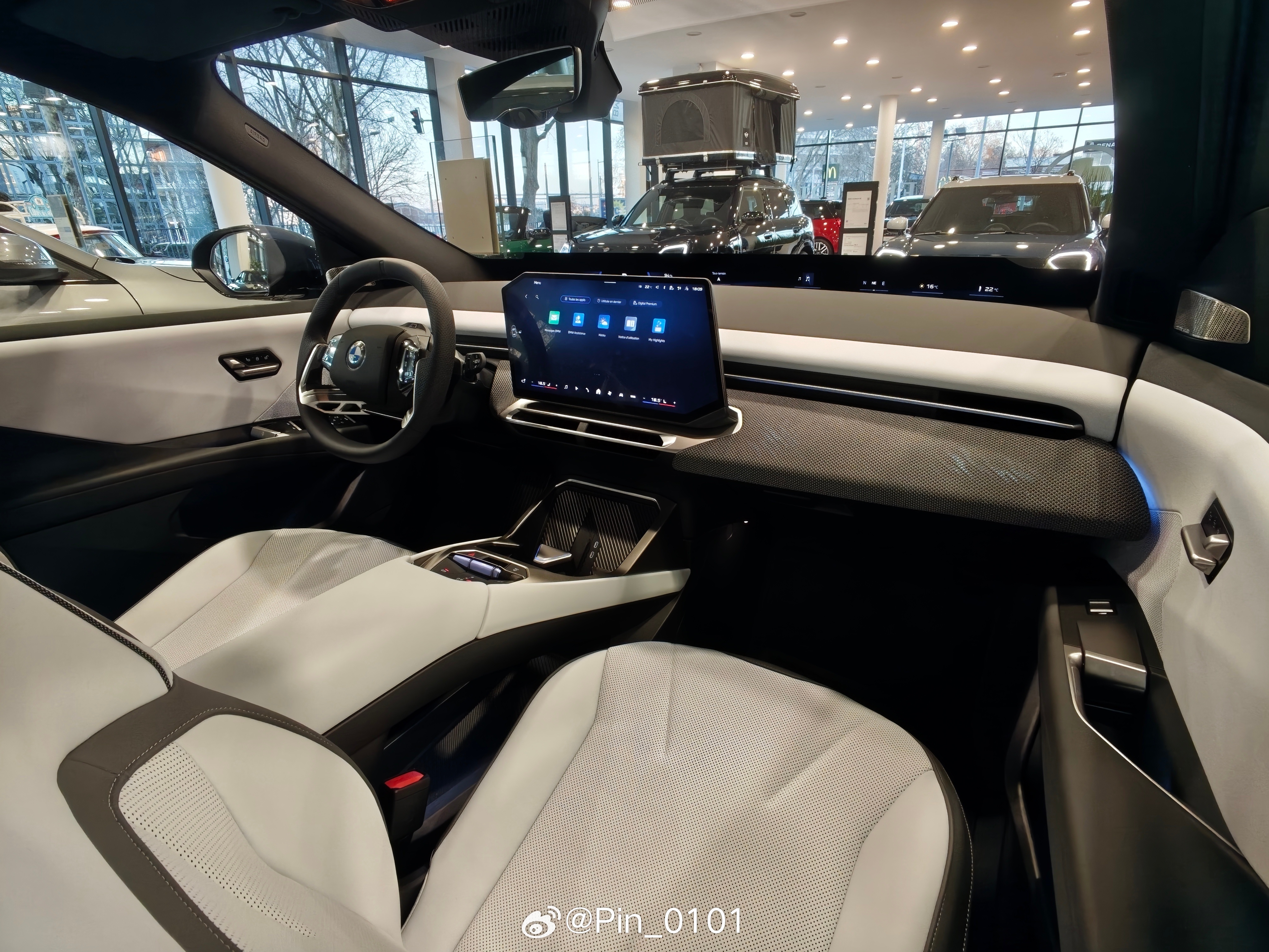 内饰整体用料和X3类似:织物+仿皮材质。仪表台前方的“天际屏”目测好像显示面积比小米YU7要小。中控屏幕没有偏向驾驶员一侧,我实际的感受是有点太靠近前排乘客了(在驾驶员开车时的视觉盲区边缘),开车时盲操需要熟练一下。