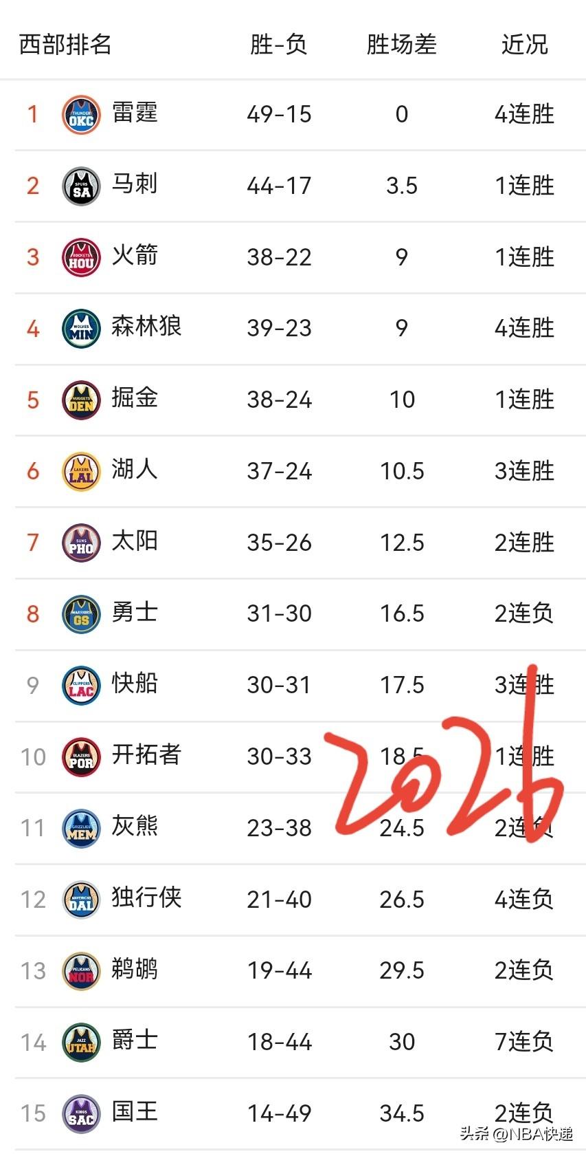 去年三月初,马刺战绩仅25胜33负,排名西部第13,一年后,他们战绩达到44胜17负,排名西部第2,仅落后榜首的雷霆(49胜15负)3.5个胜场,说是3.5个胜场,其实也就比雷霆多输2场而已,一旦双方战绩持平,马刺就将反超雷霆排名西部第一(马刺常规赛马刺3杀雷霆)。 可惜的是灰熊,去年还排名西部第4,如今他们的阵容已物是人非,仅排名西部第11。 掘金、火箭、湖人还算坚挺,依然还在西部前6,湖人和掘金比去年多输了3场,火箭多赢1场。 快船、勇士不出意外都将征战附加赛。 太阳今年真不错,布克虽然打打停停,但狄龙改变了这支球队的性格,如今他们稳居西部附加赛上半区,并且只落后第六名2个胜场,落后第三名火箭也只有3.5个胜场,前面哪位一旦经历一波连败,太阳很可能就上去了!