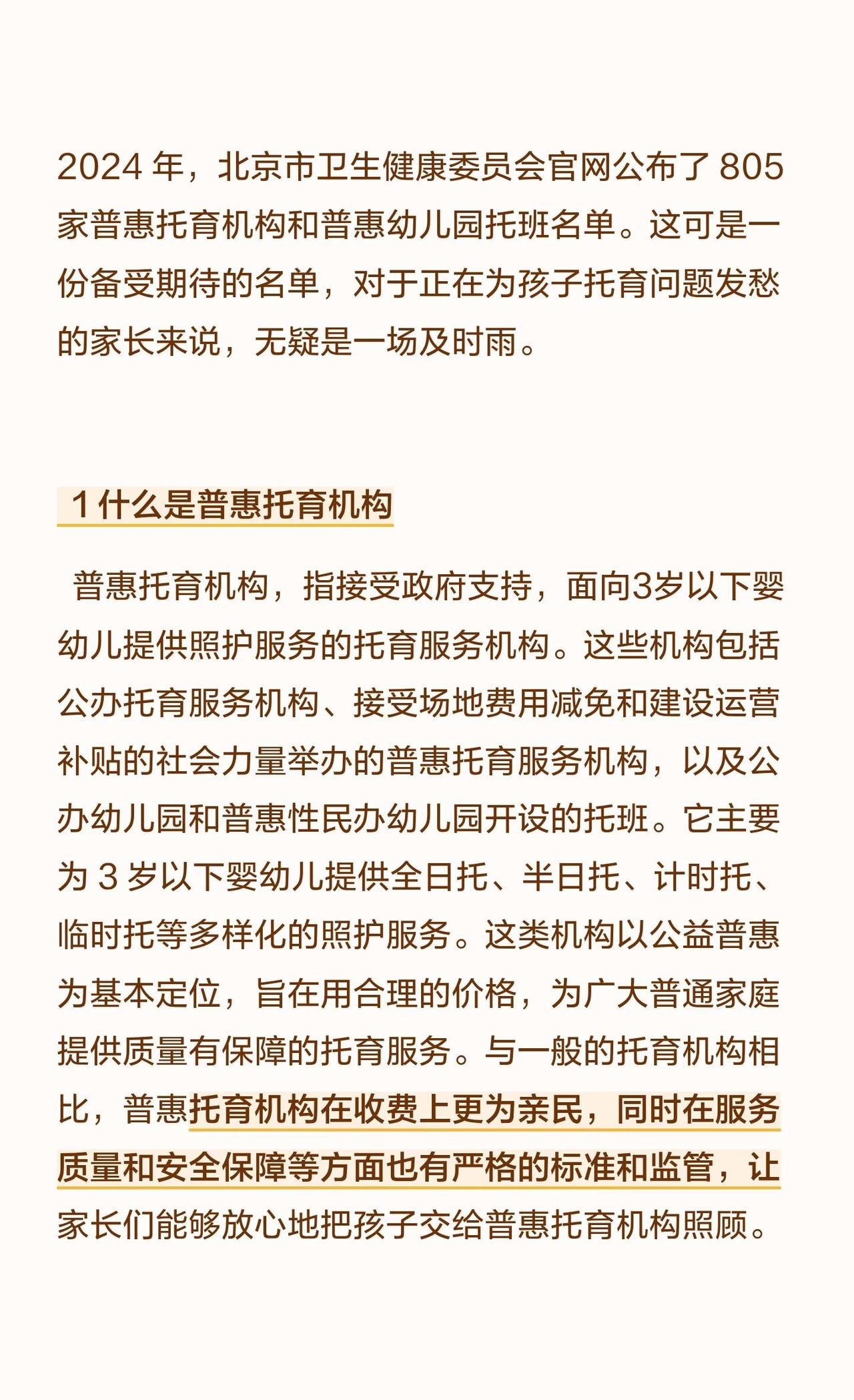 北京爸妈速存🔥805家普惠托育官方名单来了 终于等到!北京市卫健委公布805家普惠托育+普惠幼儿园托班名单 正在愁0-3岁娃没人带、托育太贵的家长,直接抄作业✅ 什么是普惠托育? 简单说:政府补贴、价格亲民、安全有监管 面向3岁以下宝宝,包含公办托育、普惠幼儿园托班、社会办普惠机构 提供全日托/半日托/计时托/临时托,主打平价+放心 为什么敢放心送?北京监管超严❗ ✅ 场地标准 安全、卫生、环保,室内外活动区达标,玩具教具定期消毒更新 ✅ 师资严格 保育员、保健医、园长全部持证上岗 2024年上万名托育从业者统一培训考核 ✅ 医育结合 卫生保健三级指导,每日消毒+定期体检,健康全程守护 ✅ 官方评估 有《北京市托育机构质量评估标准》,不合格不能评普惠 收费公开透明|均价只要市场价一半💰 政府给机构发补贴: 每孩每月1000元 + 租金补贴 首批普惠托育收费: 1200~3700元/月(不含餐费) 公办执行政府指导价,民办普惠限价,不乱收费 服务超贴心|满足上班族家庭需求 不只看娃,还做早期发展引导 游戏/音乐/绘本/社交全能覆盖 托育时间灵活,家园沟通及时 上班带娃终于能平衡了✨ 北京这波普惠托育,真的解决了千家万户的痛点 家门口就能找到安全、正规、不贵的托班 北京市普惠托育机构和普惠幼儿园托班名单(截至2024年8月),覆盖16区+经开区,含地址、电话。 👉 完整PDF: 还没做功课的爸妈,赶紧去查官方最新名单~ 最新名单也会持续跟进[玫瑰] 欢迎关注评论交流 北京托育 普惠托育海淀妈妈 北京幼儿园托班 北京宝妈北京遛娃 托班日常 早教 宝宝早教