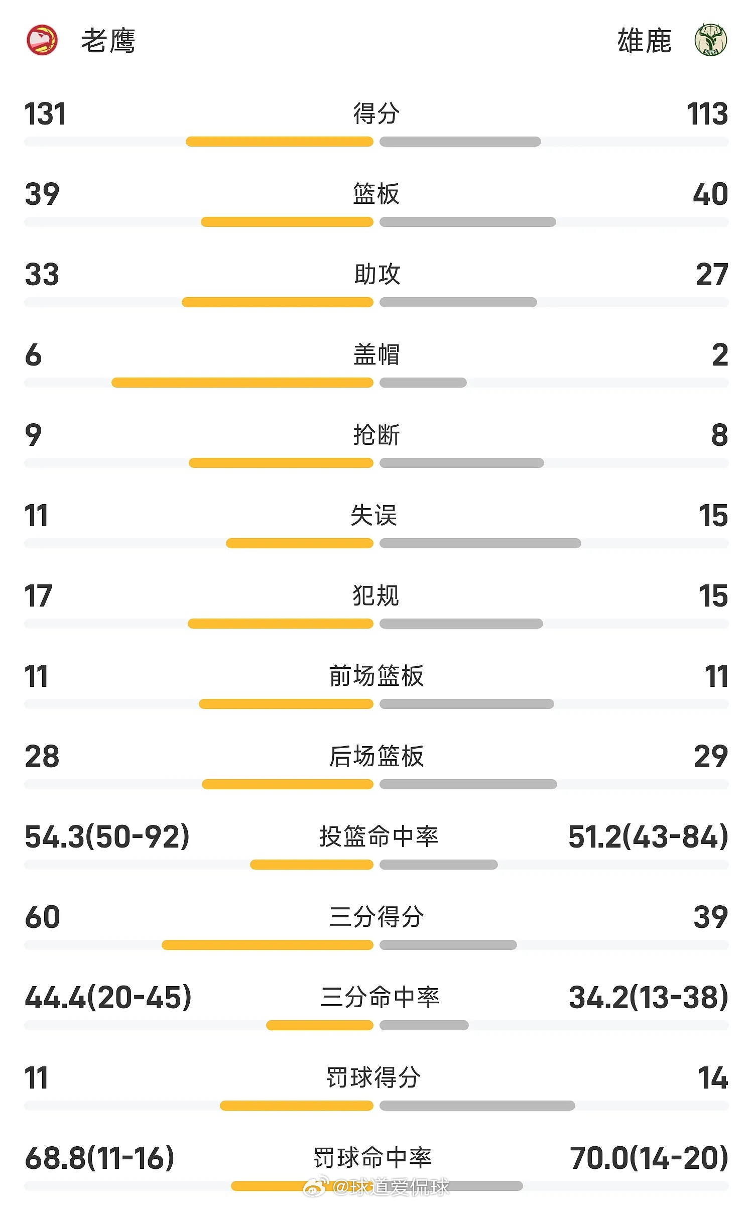 第四节,吉斯珀特+麦科勒姆飙中三分,希姆斯连得4分回应,托马斯强突内线2分命中打停比赛,老鹰保持7分的领先优势。字母哥造杀伤2罚1中,沃克反击上演单臂暴扣,丹尔尼斯上篮也有,老鹰一波6-0打停比赛。暂停回来,字母哥隔扣奧孔古,约翰逊三分造犯规三分全中,丹尔尼斯连得6分,老鹰扩大领先至18分,随着雄鹿未能做出回应,最终,老鹰客场逆转雄鹿。