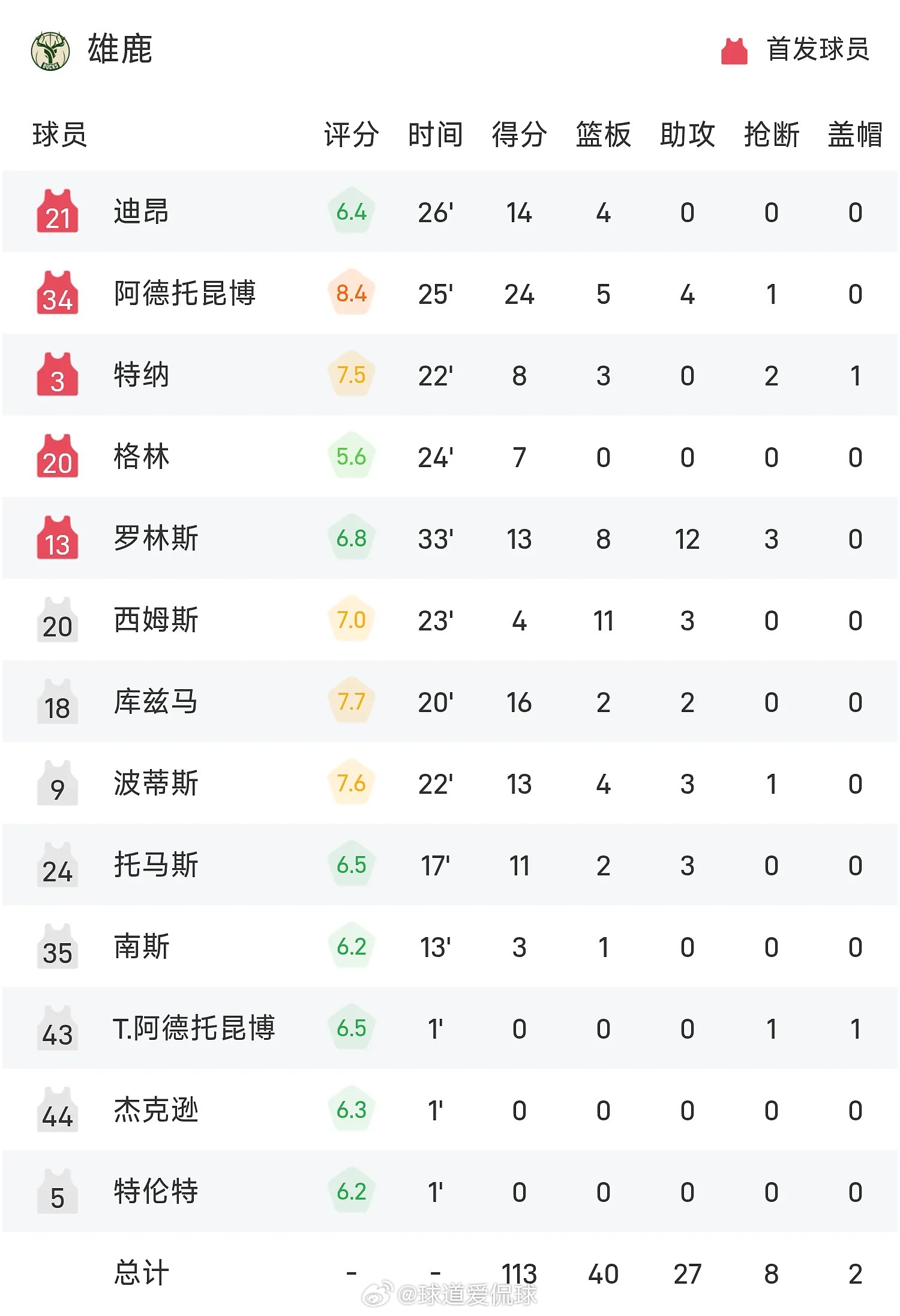 首节,字母哥迅速进入状态连投带突独砍8分,沃克+吉昂命中三分回应,雄鹿以13-9老鹰进入暂停。奧孔古和特纳对飙三分。双方换人,雄鹿继续多点开花,4分钟多轰出一波17-5的攻势创造2位数的领先优势,奧孔古2分止血,库兹马三分再中,雄鹿首节全队22中16,飙中6记三分以38-25领先老鹰。