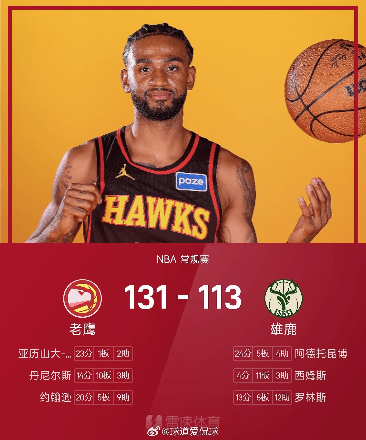 NBA 03月05日讯 25/26赛季NBA 常规赛,雄鹿对阵老鹰。双方全场战罢,雄鹿113-131不敌老鹰。亚历山大-沃克得到23分1板2助率队取胜,阿德托昆博空砍全场最高的24分5板4助。nba常规赛NBA字母哥阿德托昆博体育比赛