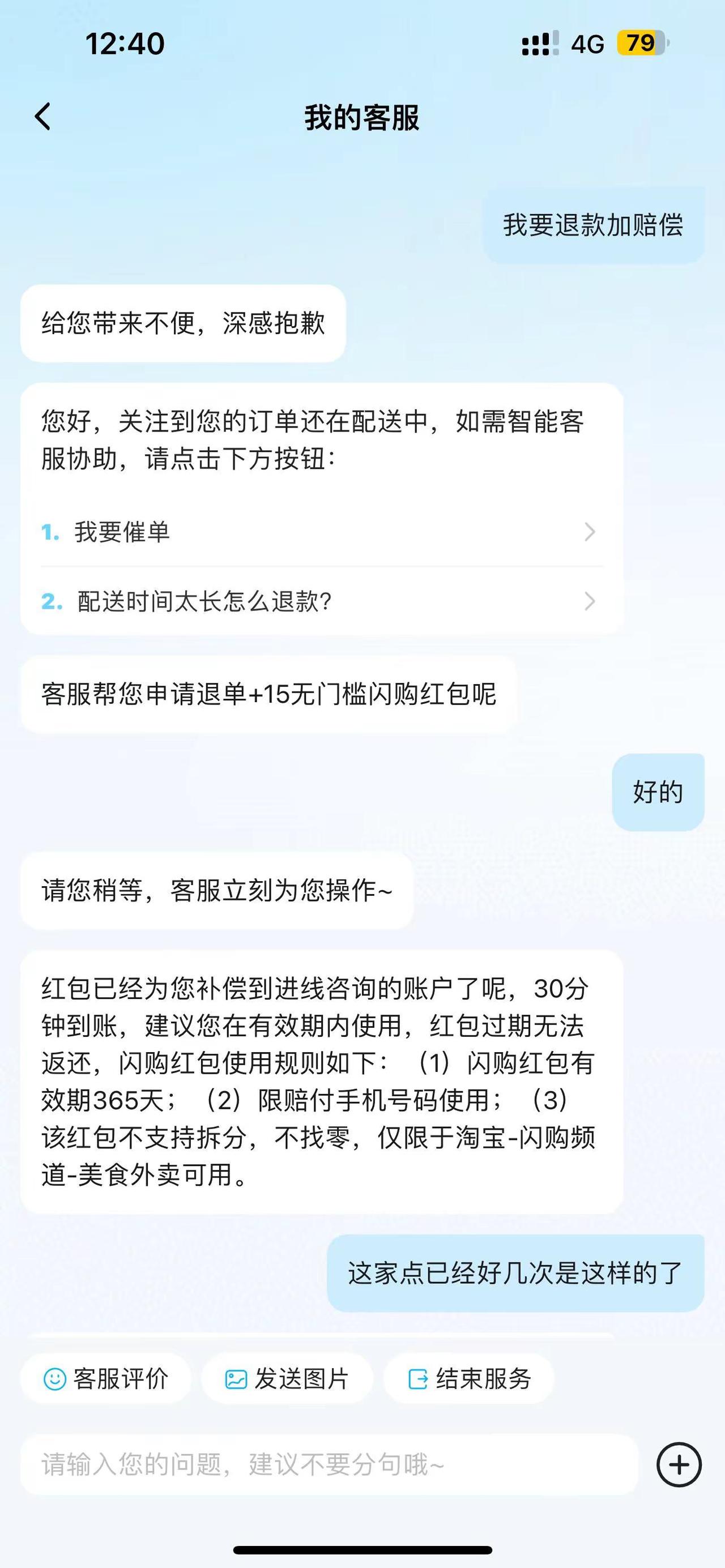 淘宝闪购超时别直接申请退款不然拿不到赔偿。淘宝闪购外卖超时别直接申请退款,不然拿不到赔偿家人们,真的被淘宝闪购外卖超时气到了!下单后商家装死、骑手恶意不送,到点根本吃不上饭,找淘宝闪购客服全是人机回复,翻来覆去就那几句话,完全解决不了问题! 踩坑后终于摸透维权方法了,赶紧给大家避坑!淘宝闪购外卖超时别直接申请退款,不然拿不到赔偿,一定要去饿了么平台找人工客服维权!跟客服说明情况要求退款+赔偿,客服会直接操作退单,还会补偿无门槛闪购红包,退款也是原路返回,最迟两个工作日就到账。 平台还会对违规的商家扣信用分,影响店铺补贴和活动,严重的还会关店,骑手也会被线下培训、重点监控,违规严重直接限制跑单甚至永不录用! 把这个维权方法分享出来,希望宝妈们和各位姐妹再遇到这种情况,都能顺利维护自己的权益,别再受这种气了!