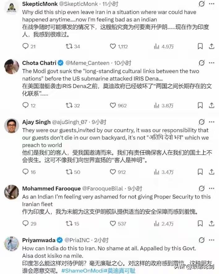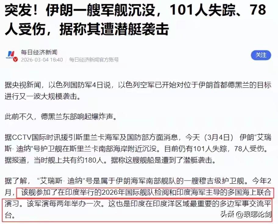 刚参加完印度军演 180人战舰被美击沉 印度为何全程隐身 看完真的气到发抖!这脸打得啪啪响 2026年3月3日夜至4日凌晨,央视新闻、斯里兰卡军方证实:伊朗迪纳号护卫舰刚参加完印度米兰-2026军演,在斯里兰卡以南40海里公海,被美军潜艇用MK-48鱼雷击沉,从遇袭到沉没仅10分钟。 舰上180名官兵,32人获救、87具遗体打捞、101人失踪,这是二战后美军潜艇首次实战鱼雷击沉战舰。 最讽刺的来了: 斯里兰卡第一时间派舰机搜救,守着人道主义底线。 自诩印度洋霸主的印度,全程隐身、零救援、零谴责,只轻飘飘一句“遗憾”。 人家高高兴兴来给你撑场面、参加你的演习,在你家门口被精准猎杀,印度从头到尾在干嘛? 航线是谁泄露的? 东道主的责任去哪了? 所谓区域主导权,就是看着客人被击沉吗? 嘴上喊霸权,遇事装哑巴,印度洋霸主的人设彻底碎了。 国际局势瞬息万变,真相与立场我都给你讲透。 关注我,不被带节奏,第一时间看硬核深度解读。