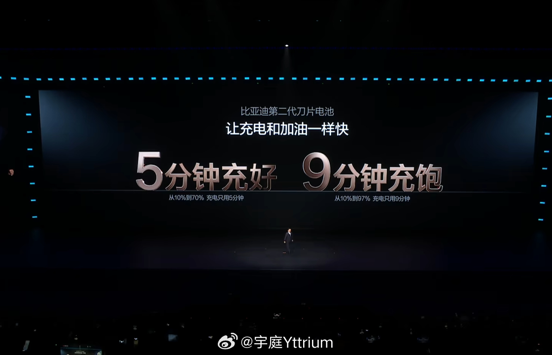 比亚迪今晚发布二代刀片及闪充 船夫哥在发布会上给了个数据,其实现在社会为更少的新能源车建设了更多的公共充电站,但仍然解决不了续航焦虑的问题。节假日高速路上仍然排队,北方冬天仍然难熬。因为充电太慢,天冷充得更慢——这也是我家里一直留着增程车和燃油车的原因,实际上发布会上举例的北京,冬天和我自驾常去的长白山、黑河比起来都算得上温暖的。大量的充电桩在空置或者以很低的补能效率工作,大量的资源在浪费。而要从根源上解决这个问题,还是要看电池。比亚迪第二代刀片电池能够做到常温9分钟充满(97%,留3%用来能量回收),零下20℃ 12分钟充满。原来比亚迪之前一直不建充电站,是在等技术突破。接下来看看比亚迪的闪充计划如何,如果东北也能很快建设起来,我也准备淘汰汽油了。大v聊车