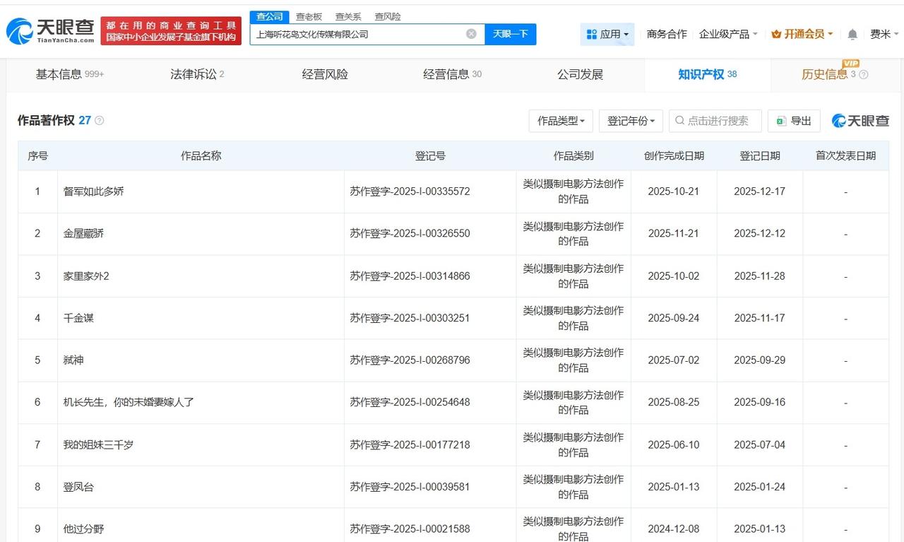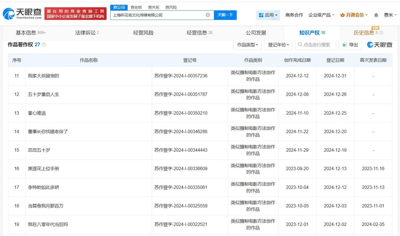 揭秘叶璇参演短剧出品方听花岛已登记多款热播短剧作品著作权 叶璇说拍短剧老爽了 据媒体报道,近日,叶璇出演的短剧《少夫人来自东北》观看量、热度值双破亿,相关话题引发关注。 天眼查App显示,该剧出品方听花岛关联公司上海听花岛文化传媒有限公司成立于2023年4月,法定代表人为赵晨,注册资本100万人民币,经营范围包括组织文化艺术交流活动、广播电视节目制作经营、电影摄制服务等。股东信息显示,该公司由赵晨、李荟琴共同持股。知识产权信息显示,该公司曾登记“我在八零年代当后妈”、“家里家外2”等多款热播短剧作品著作权。 天眼查信息: