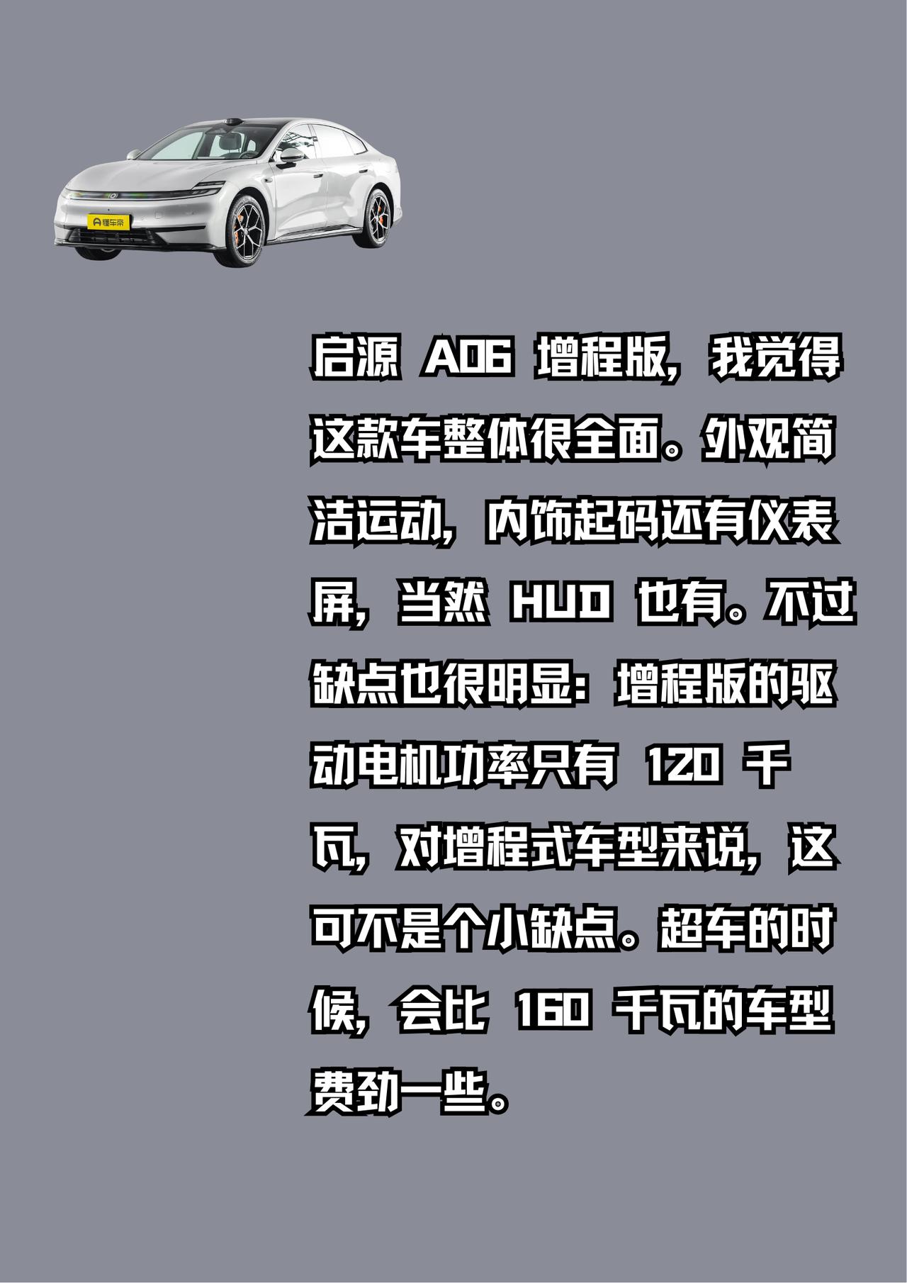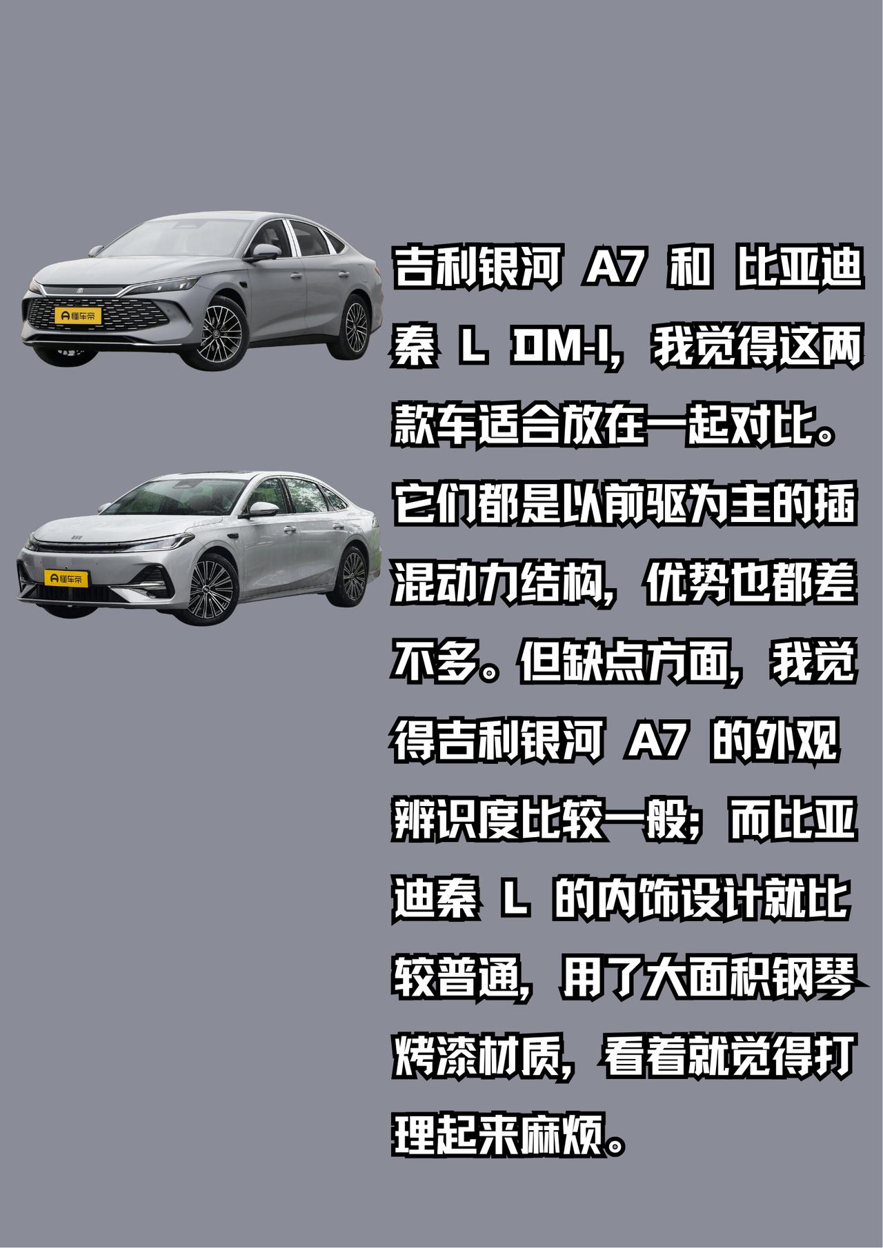 10 万元插混轿车该怎么选? 相信很多小白都在纠结这个选车难题。其实这个价位可选的车型还真不少,比如启源 A06,还有吉利银河 A7 EM-i 和比亚迪秦 L DM-i。 今天我们就来好好分析一下,这几款车到底怎么选才更适合你! 启源 A06 增程版,我觉得这款车整体很全面。外观简洁运动,内饰起码还有仪表屏,当然 HUD 也有。不过缺点也很明显:增程版的驱动电机功率只有 120 千瓦,对增程式车型来说,这可不是个小缺点。超车的时候,会比 160 千瓦的车型费劲一些。 吉利银河 A7 和 比亚迪秦 L DM‑i,我觉得这两款车适合放在一起对比。它们都是以前驱为主的插混动力结构,优势也都差不多。但缺点方面,我觉得吉利银河 A7 的外观辨识度比较一般;而比亚迪秦 L 的内饰设计就比较普通,用了大面积钢琴烤漆材质,看着就觉得打理起来麻烦。【来自懂车帝车友圈】