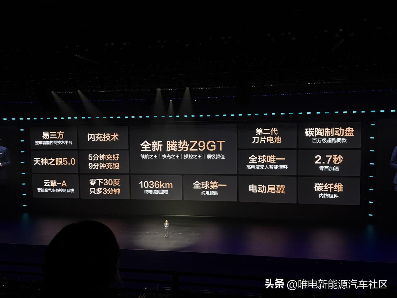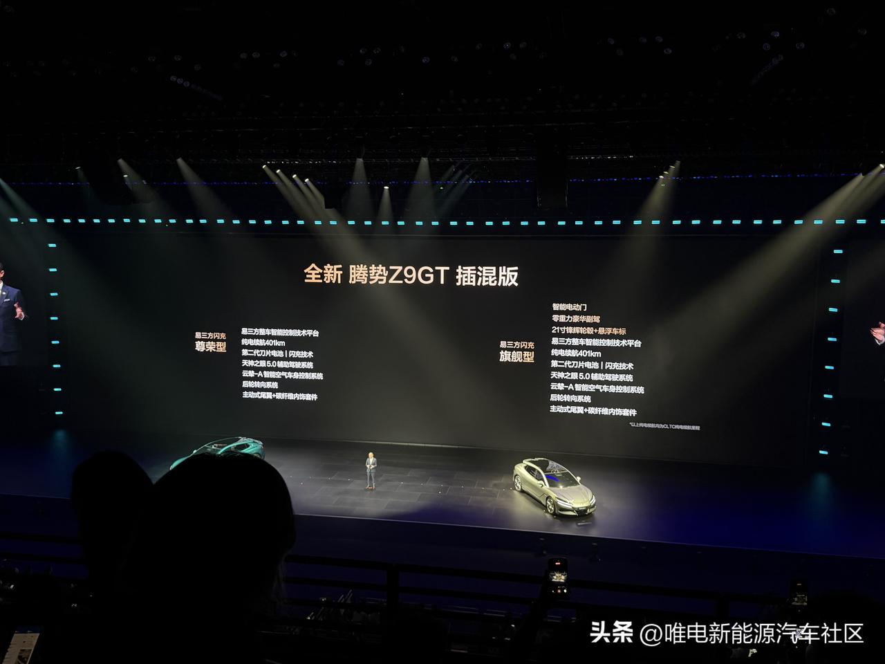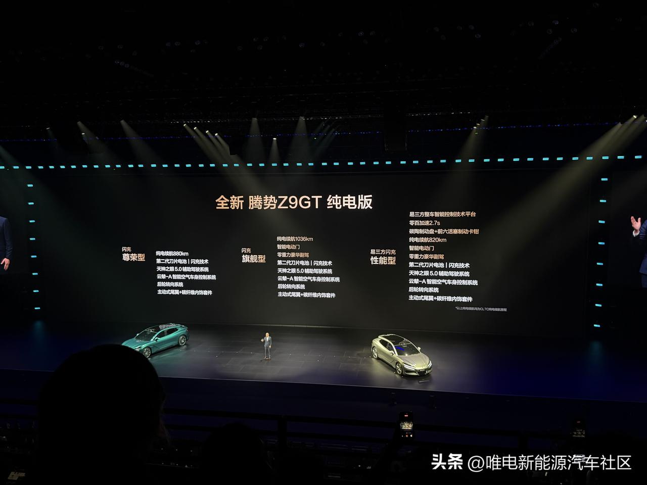 比亚迪闪充发布会腾势环节[思考] 新款腾势Z9 GT发布,插混版售价30.98-33.98万元,纯电版售价26.98-36.98万元[思考] 纯电版新增122.5kWh电池,续航里程1036km;插混版新增63.8kWh电池,纯电续航401km,综合续航里程1301km[思考]部分配置新增高精度无人智能漂移功能、搭载碳陶制动盘[思考]外观上,激光雷达挪到了车顶,提供峡湾绿车漆+熔岩红内饰,快充口改为仅一个[思考]