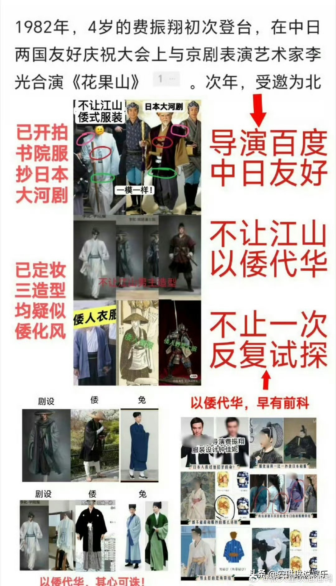 杨洋新剧《不让江山》未播先火,剧组的服化道"以倭代华",因四大争议被推上风口浪尖!服化道深陷“倭风”争议,剧中杨洋饰演的男主李叱部分戏服,被指高度模仿日本武士装束,腰带结打法也与和服一致,男二造型更精致,与中式汉服美学背道而驰。导演费振翔此前作品也曾陷入类似争议,此次又被质疑存在“以倭代华”惯性,而费振翔幼年经历被翻出,叠加剧组删除“倭风”投诉内容,更是激化公众对其文化立场的质疑。剧本魔改与角色权重失衡也是一大问题,原著中男主李叱的智谋、武力被削弱,新增低俗设定,点题台词被移植至男二父亲遗言。而男二则获得原著男主高光特质,戏份分配也严重倾斜,网传剧本中男二、男三戏份占比超七成,女主更是从原著“有勇有谋的官配”降为男三跟班。