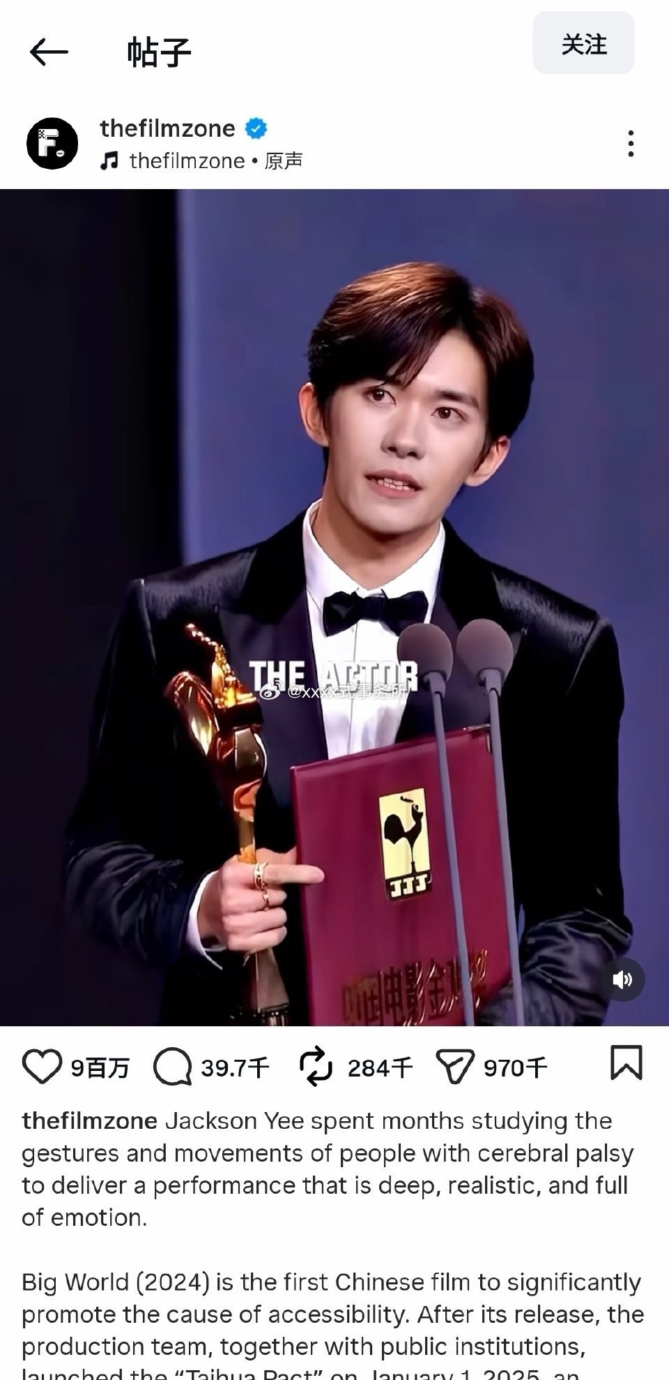 易烊千玺ins获奖演技向900万赞达成!浏览量8100万+,转发97万+,热评内赞55万+非本人账号✔️单人视频✔️近期国内国外最热视频之一 易烊千玺电影惊蛰无声