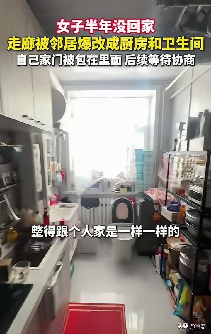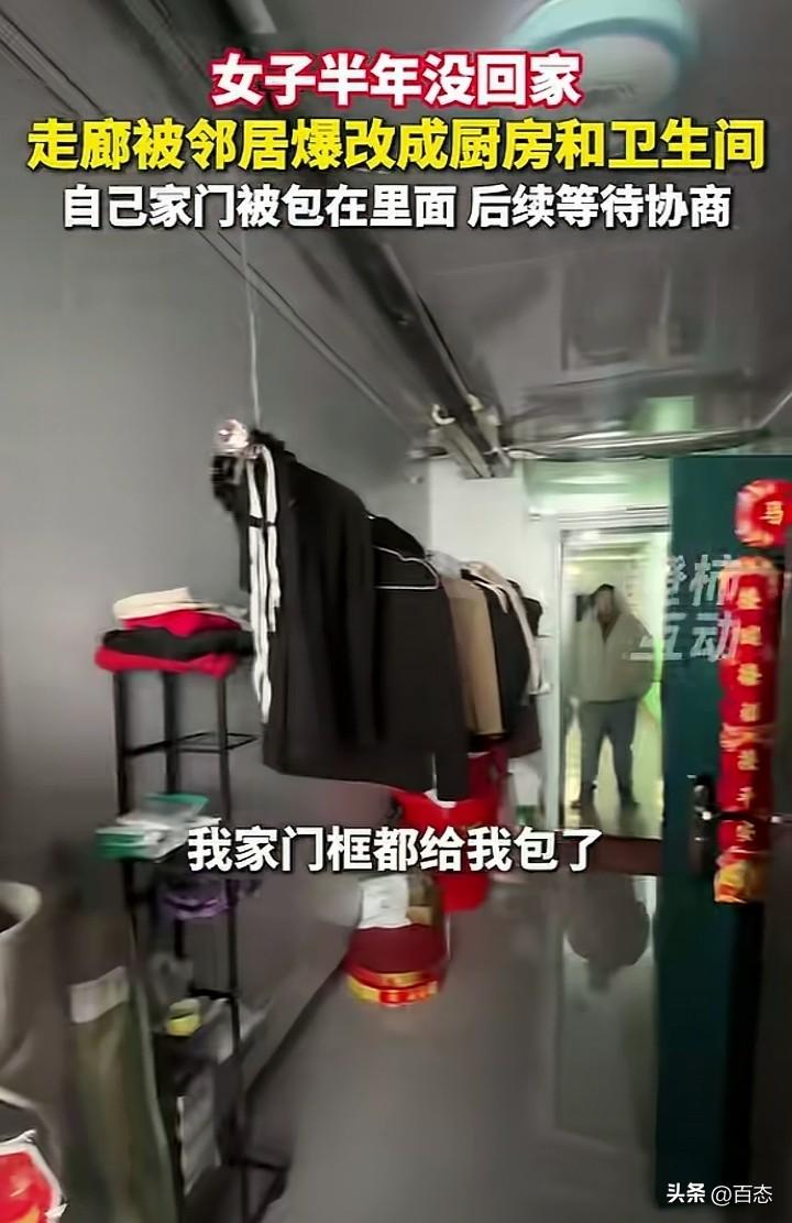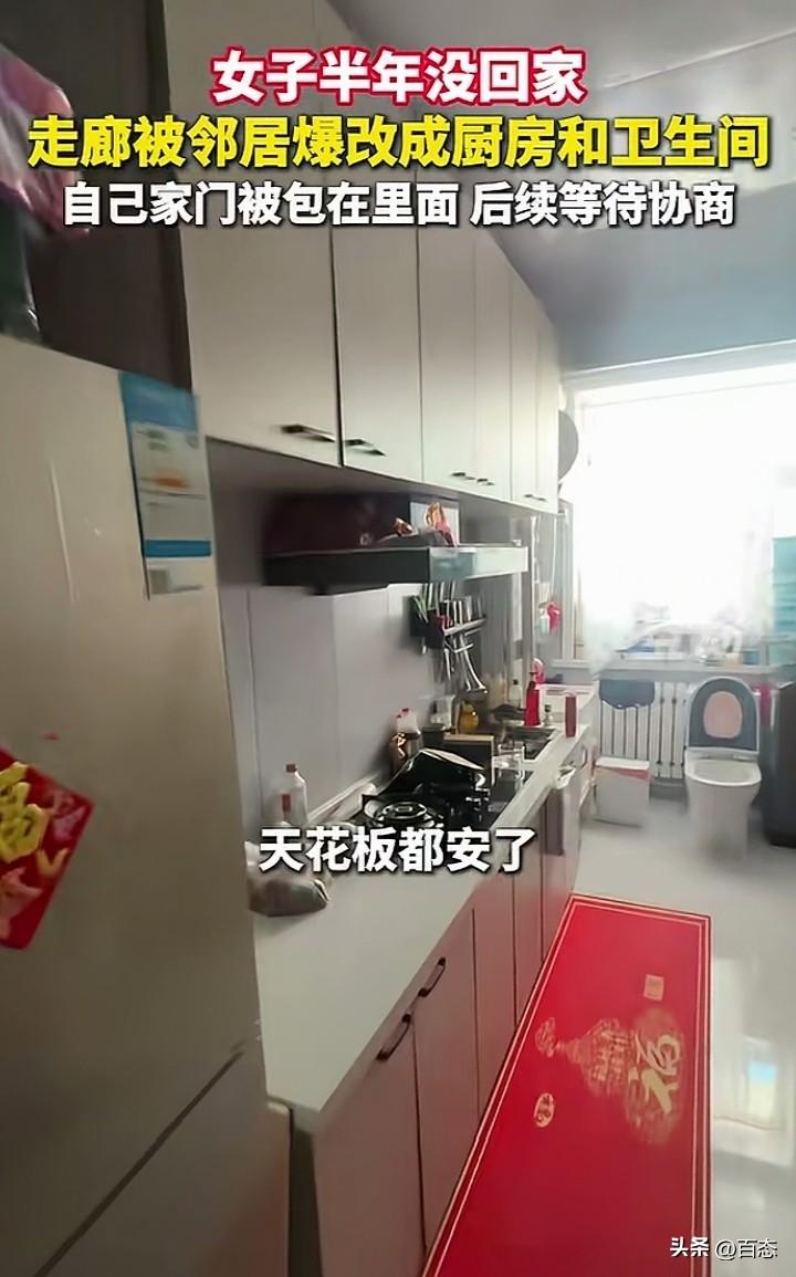 不敢相信,内蒙古一女子半年没有回过家,也没有住。没想到一回家被眼前的 场景给惊讶到了,走廊被邻居铺了砖,天花板也都安了,被改成了厨房和卫生 间。说实话遇到这样的邻居也是倒霉,公共区域不经过大家同意,就改装,这 不是违法行为吗?自己的家门都被包了门框,女子很是无语,希望能协商好。 公共区域是大家的,作为私用,确实是太自私了,如果是你会怎么做呢?