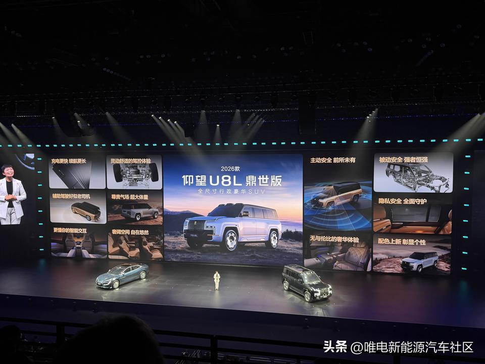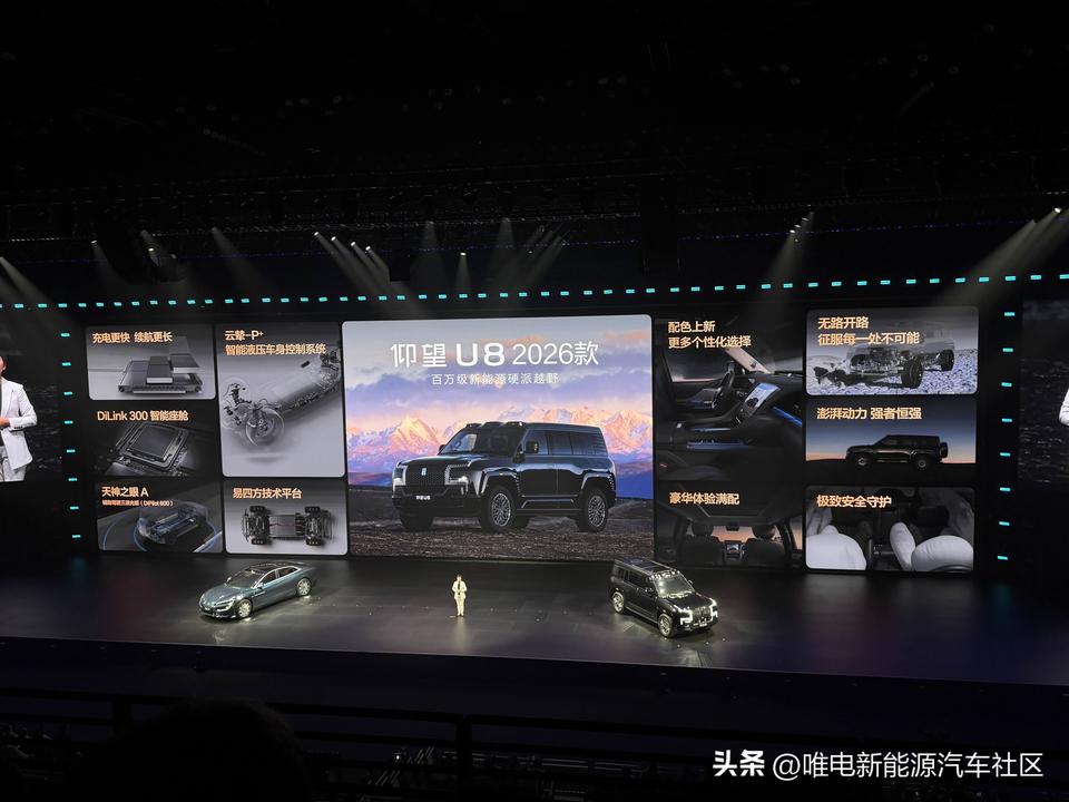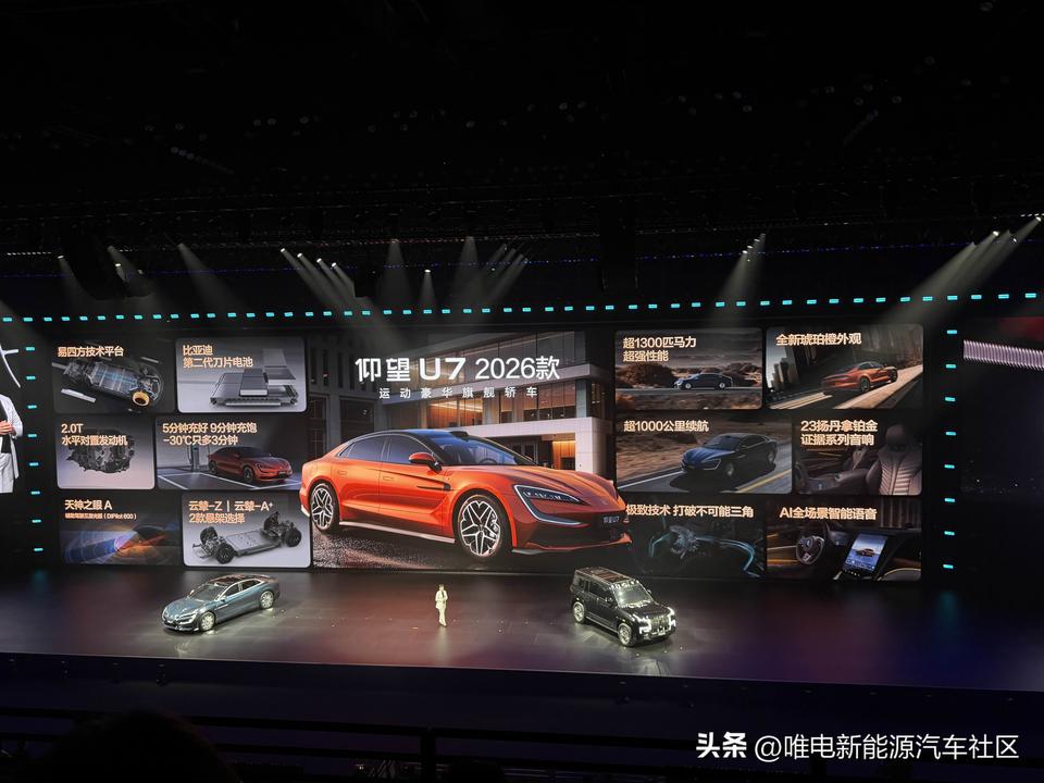比亚迪闪充发布会仰望品牌环节[思考] 2026款U7:售价65.8万元起,提供全新琥珀橙车漆,纯电版续航里程提升至1006km+闪充,插混版综合续航1100km+闪充,有云辇Z、云辇A+两种悬架选择[思考] 2026款U8:售价100.8万元起,搭载全新云辇P+智能液压车身控制系统,综合续航里程提升20.5%+闪充,还有更多新配色[思考] 2026款U8L鼎世版:售价130万元起,纯电续航230km+闪充,新增NOA爆胎稳行稳停功能、应急浮水紧急自动激活、全场景隐私安全,这3项安全升级也会OTA推送[思考]